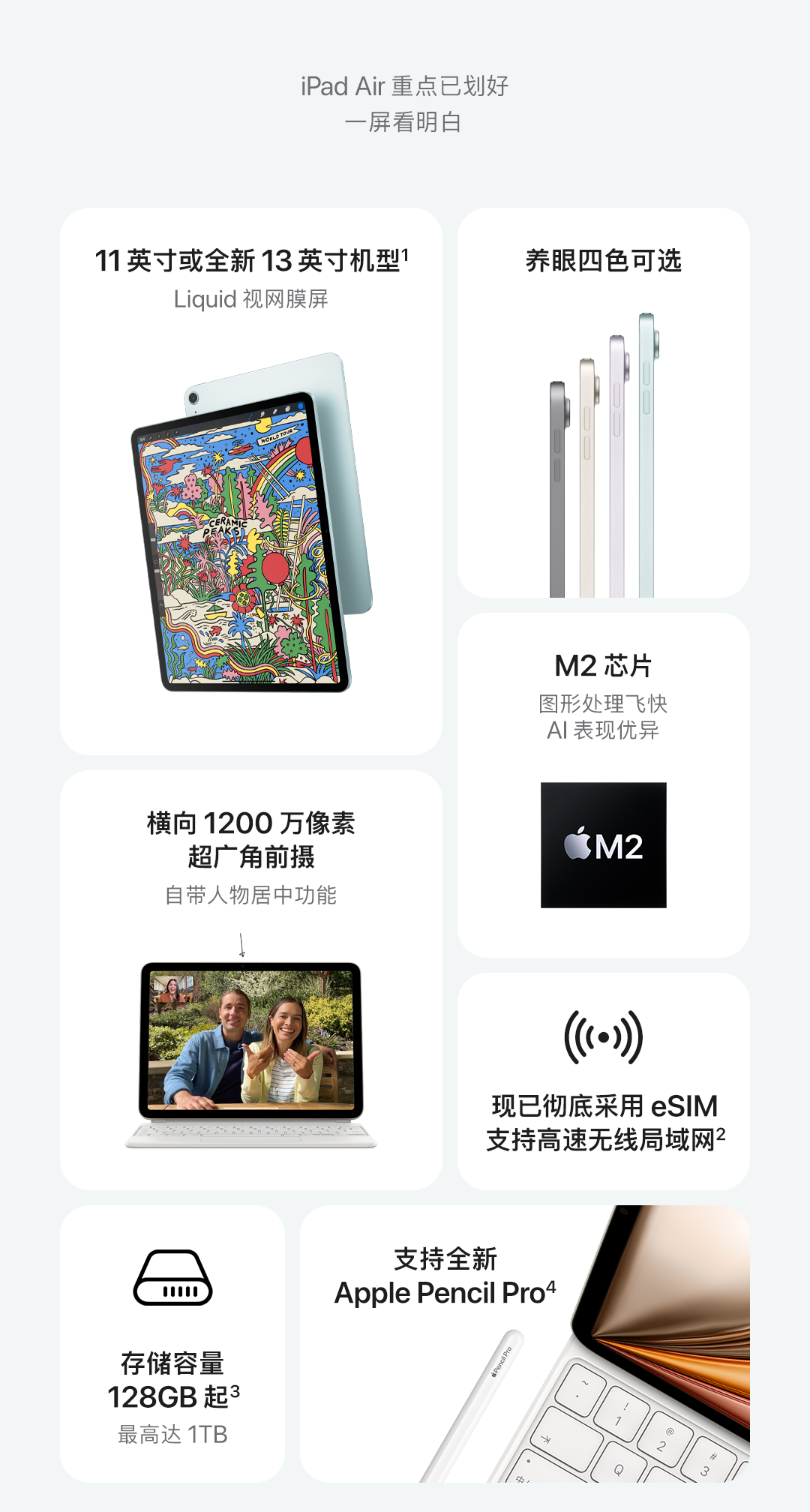 首先是主力选手 iPad Air ,这条产品线头一次出现了两种不同的尺寸—— 11 和 13 英寸。