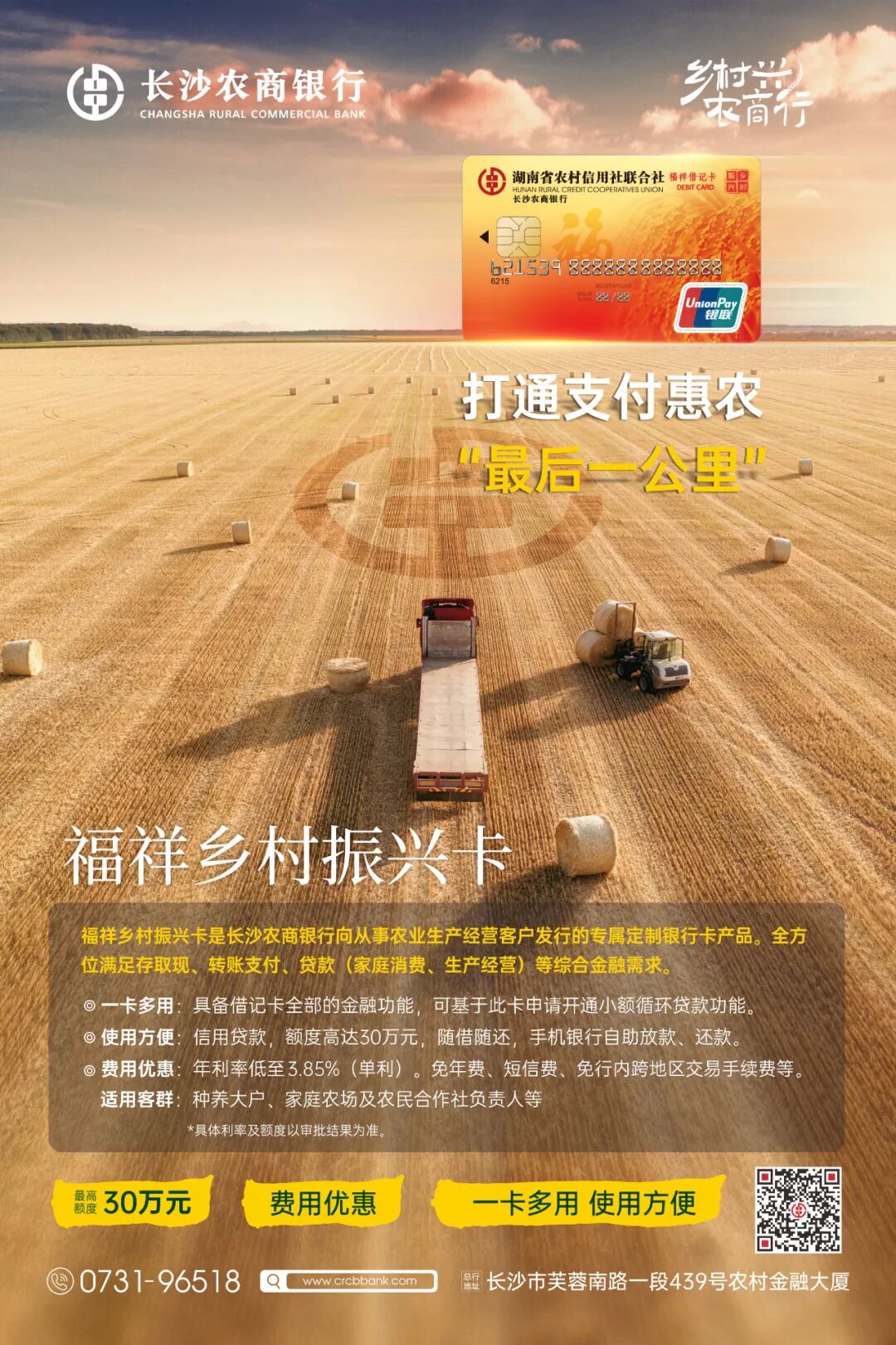 福祥乡村振兴卡是长沙农商银行向从事农业生产经营客户发行的专属定制银行卡产品。全方位满足存取现、转账支付、贷款(家庭消费、生产经营)等综合金融需求。