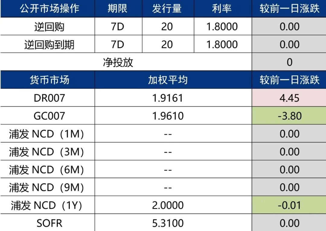 资金面整体均衡偏松:4月25日,为维护银行体系流动性合理充裕,央行开展20亿元逆回购操作,中标利率为1.8%,与此前持平。当日有20亿元7天期逆回购到期,因此实现单日零投放零回笼。 早盘大行国股有部分融出,银行均衡,非银偏松。隔夜押利率1.90%-1.93%成交,押存单信用在1.93%至加权+10bps成交。7天14天跨月押利率1.95%-2.00%成交,押存单信用1.98%至2.00%成交。随后隔夜融出减少,押存单信用1.92%-1.95%成交。午后资金面略有收紧,隔夜利率加权-1.95%成交,押存单信用1.95%需求较多。三点后隔夜融出增多,押利率存单1.88%至1.90%成交。临近尾盘隔夜押利率最低成交至1.85%,押存单最低成交至1.85%,整体保持均衡偏松至收盘。价格方面,DR001为1.86%,DR007为1.92%,DR014为1.99%。