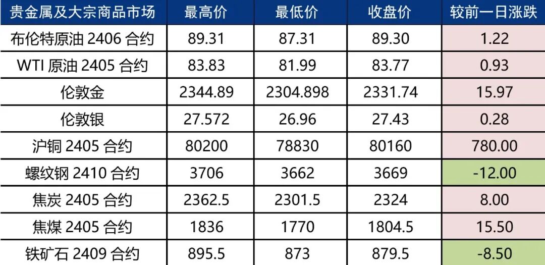 隔夜美元指数上涨0.11%,收在105.81。随着美国经济保持强劲增长,投资者减少了对美联储降息的押注,资金涌入美国,美元指数正在飙升至106附近。日本央行在上月结束了现代史上最激进的货币宽松政策后,预计在本周五将把基准利率维持在0%—0.1%区间。日元本周已跌至34年新低,这使得日本央行更有可能缓和其保持宽松政策的立场。
