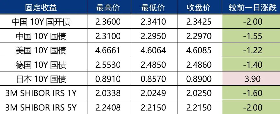 现券多数走强,10年及30年期国债期货再创新高:4月22日(周一),银行间主要利率债收益率多数下行,截至发稿,10年期国债活跃券“24附息国债04”收益率下行0.9bp报2.245%,对比中债国债到期收益率,创2002年4月底以来新低;10年期国开活跃券“24国开05”收益率下行1bp报2.3125%,盘中第一度跌至2.306%,为2003年底以来新低。国债期货多数收涨,10年及30年期主力合约再创新高。国债方面,186D 230024成交在1.54-1.56,2.57Y 230025成交在1.96-1.98,4.48Y 230022成交在2.07-2.11,6.4Y 230019成交在2.22-2.24,9.34Y 230018成交在2.3-2.34,29.48Y 230023成交在2.43-2.48。金融债方面,25D 230206成交在1.67-1.69,1.86Y 210203成交在1.97-2.01,4.09Y 230208成交在2.11-2.16,5.41Y 190215成交在2.21-2.23,9.08Y 230210成交在2.34-2.38。