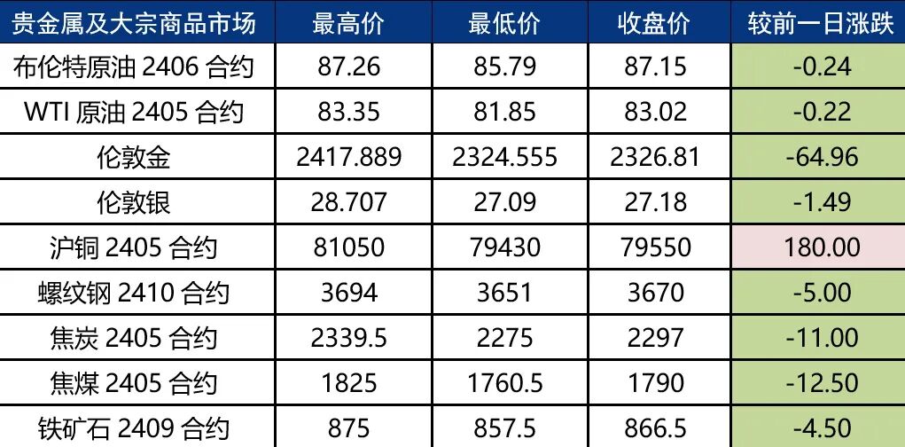 黑色系价格普遍下跌:04月22日,沪铜主力合约上涨180元,涨幅0.23%;螺纹钢主力合约下跌5元,跌幅0.14%;焦炭主力合约下跌11元,跌幅0.48%;焦煤主力合约下跌12.5元,跌幅0.69%;铁矿石主力合约下跌4.5元,跌幅0.52%。
