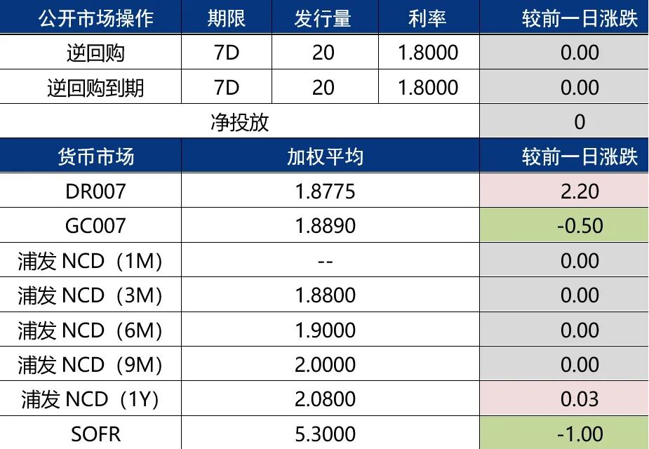 资金面整体均衡偏松:4月22日,为维护银行体系流动性合理充裕,央行开展20亿元逆回购操作,中标利率为1.8%,与此前持平。当日有20亿元7天期逆回购到期,因此实现单日零投放零回笼。 早盘,大行国股部分融出,银行偏紧,非银偏松。隔夜押利率1.90%成交,押存单信用在1.90%至加权+10bps成交。7d押利率1.90%成交,押存单信用1.90%至1.95%成交。随后融出ofr减少,隔夜押利率存单信用1.95%成交,7天押利率1.93%成交。午后资金面延续均衡态势,隔夜利率加权-1.90%成交,押存单信用1.90%-1.93%成交。临近尾盘隔夜押利率最低成交至1.80%,押存单最低成交至1.85%,整体保持宽松至收盘。资金面维持均衡偏松态势直至收盘。价格方面,DR001为1.78%,DR007为1.84%,DR014为1.94%。