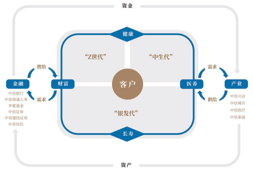 对于非金融需求,中信银行构建了“内外双循环”的养老金融综合服务生态圈。