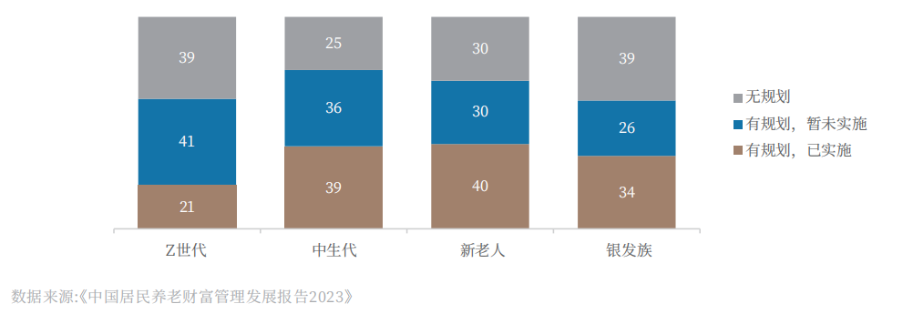 在此背景下,我们需要更早地启动个人养老规划。然而,中信银行发布的《中国居民养老财富管理发展报告2023》显示,合计近八成的“Z世代”仍然对养老维持观望状态。由此可见,“Z世代”人群尚未为养老提前做好充足的准备。