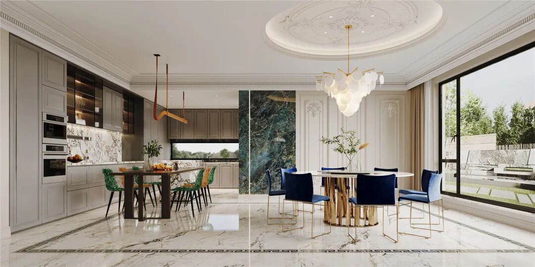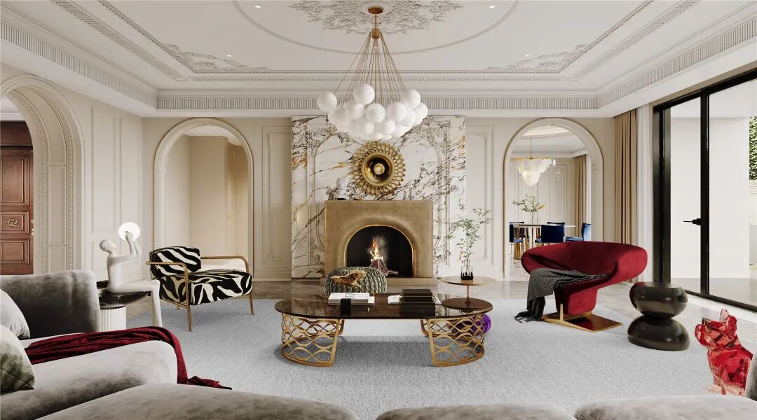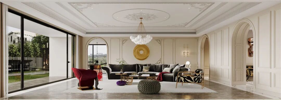 步入一层客厅,仿佛进入了一片充满活力与繁华的宫廷一般,多巴胺的配色主导着整个环境,引发出内心的愉悦感,法式风特有的元素石膏雕刻出精致的艺术画作,透过大面积的落地窗,享受着日光与绿荫,心也随之放松、沉静下来。