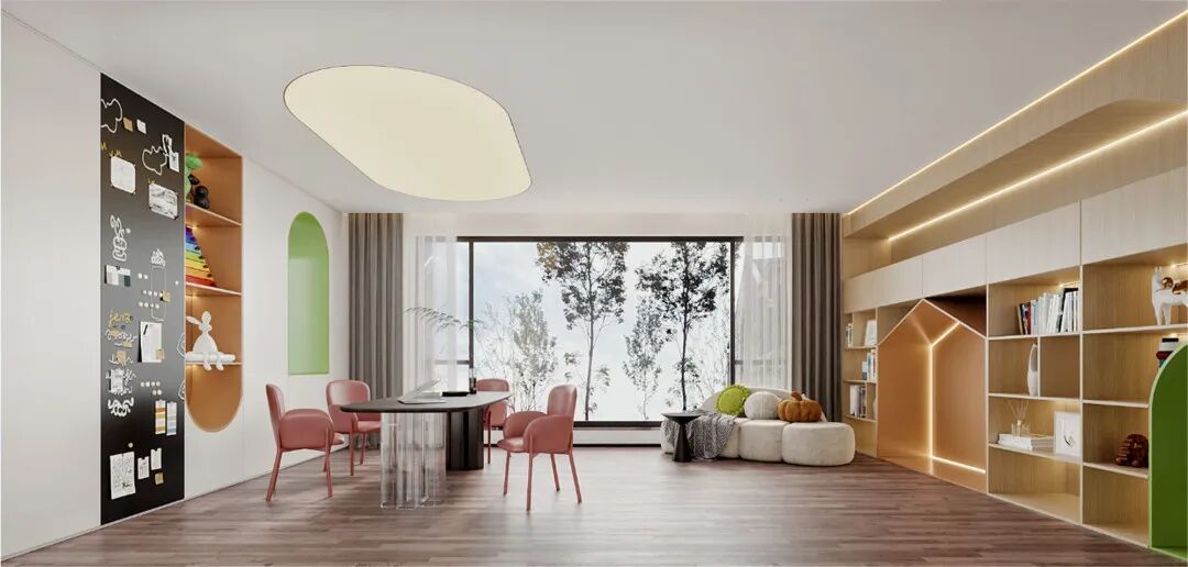 负一活动室在明亮鲜艳的配色中烘托出整个空间的欢快热烈氛围,激情活泼,饱含生命的活力,在柔雅独特的柱梁结构下,浅米黄色的墙壁,如同温暖的日落。