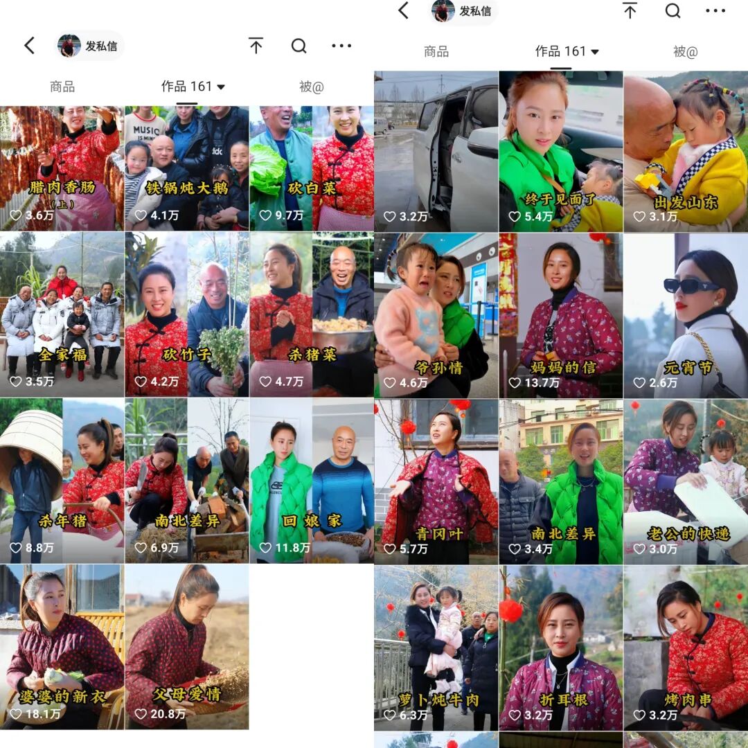 她用一年左右的时间,靠农村生活内容完成了账号从0到1的积累,吸引了快手百万老铁的关注,账号流量也在这时陷入瓶颈。
