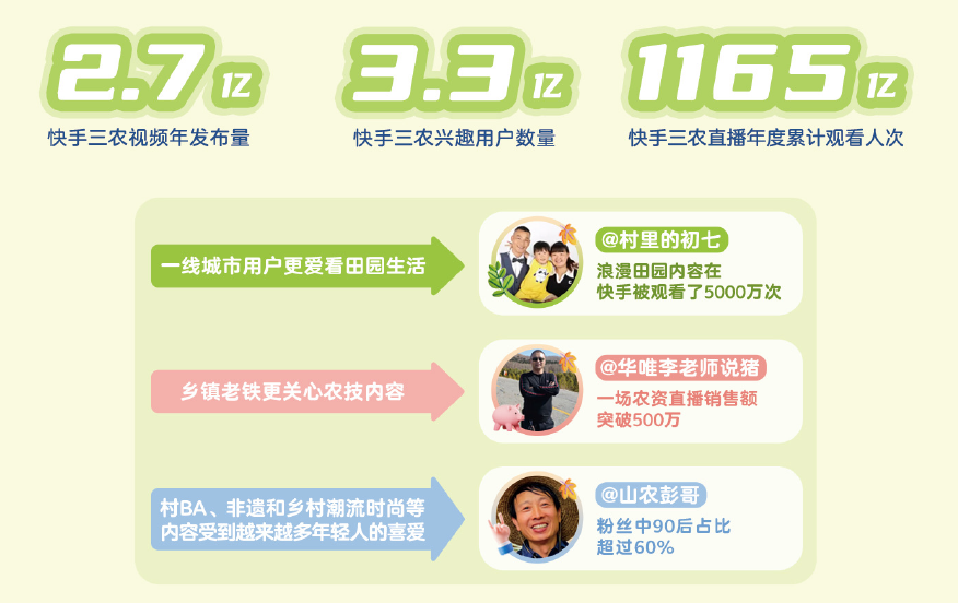 《2023快手三农生态数据报告》(下文简称报告)显示,截至2023年,快手有3.3亿三农兴趣用户,快手三农视频年发布量达2.7亿,快手三农直播年度累计观看人次达1165亿,10万的快手三农万粉创作者年涨粉量达19亿。