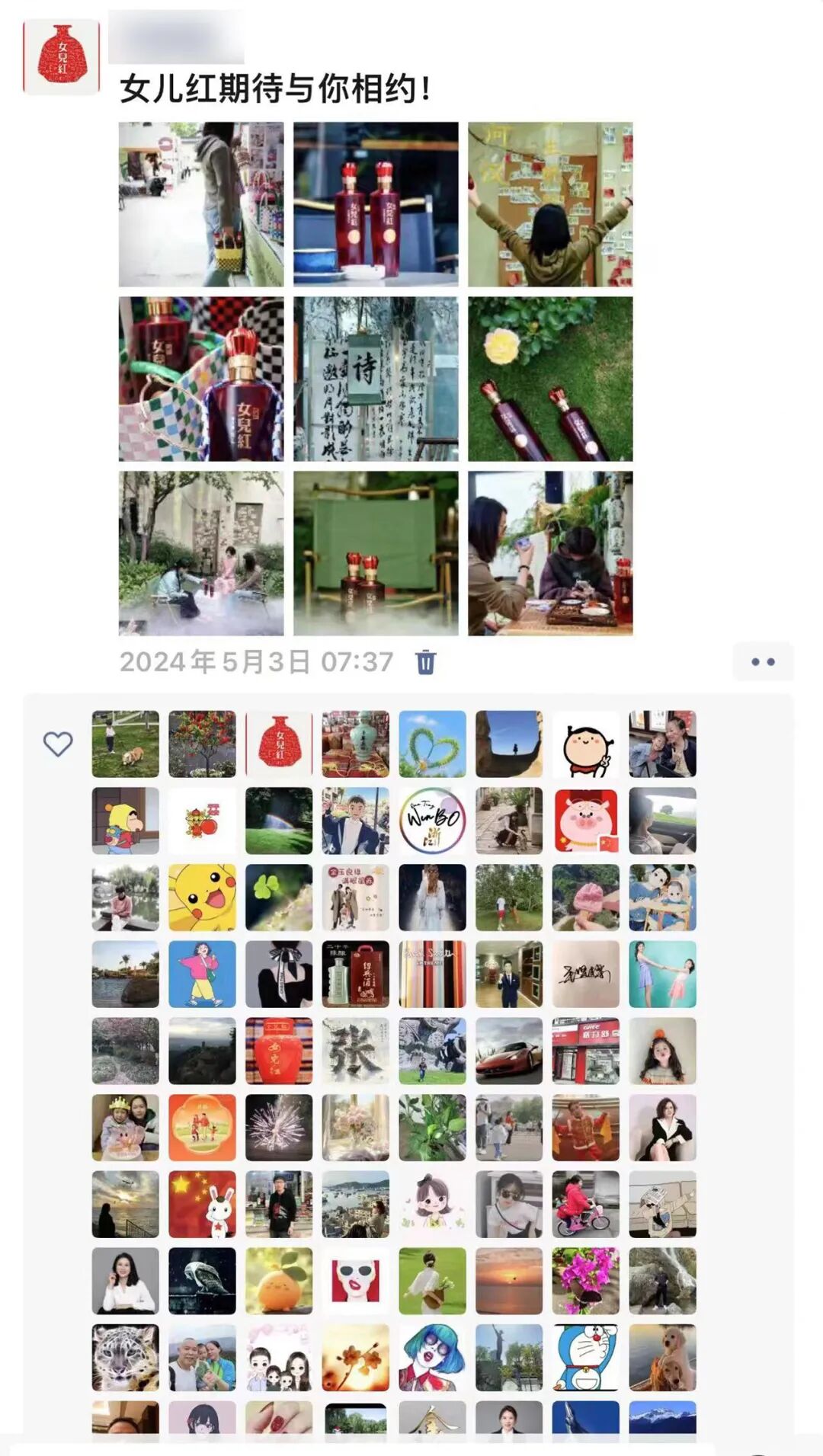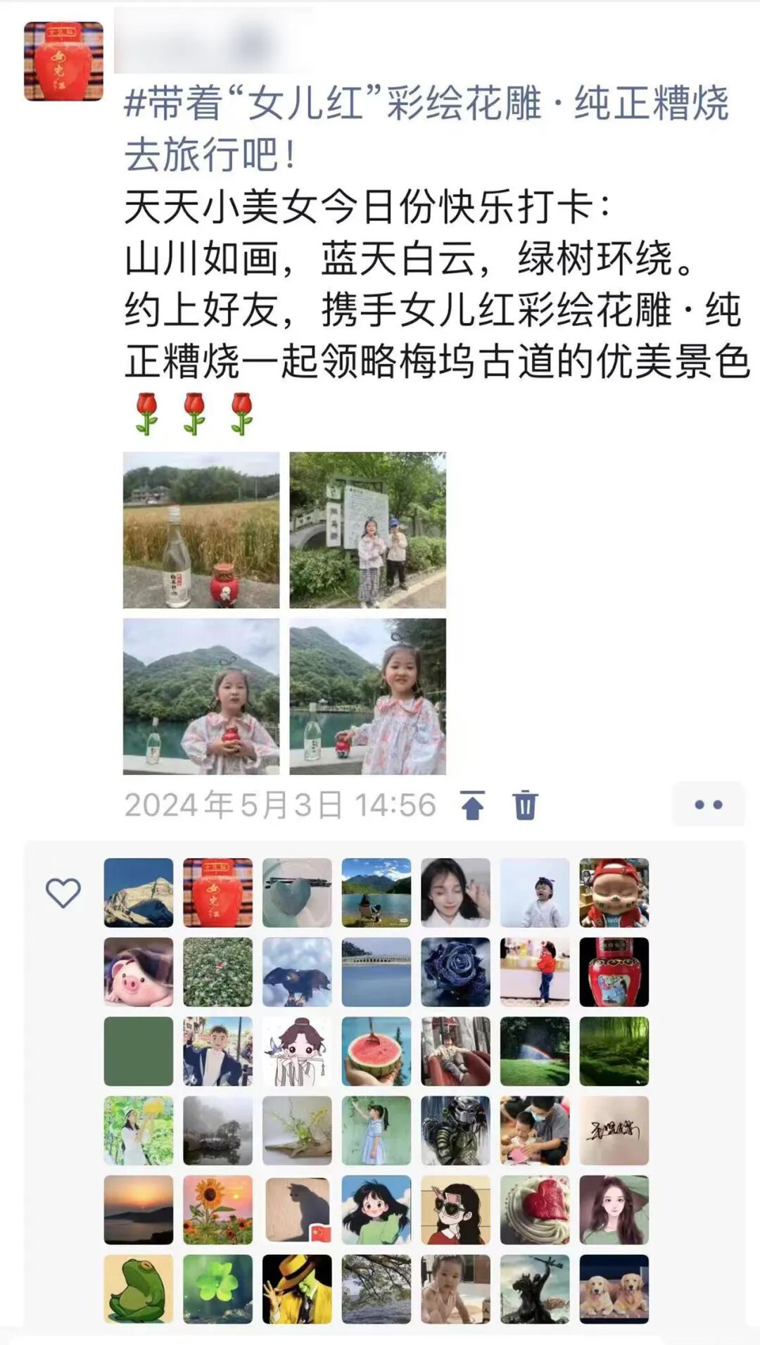 借势“五一”长假流量,通过新媒体传播渠道,向更多的人分享女儿红故事和推广女儿红产品,公司团委与启航班共同发起:带着“女儿红”去旅行的活动倡议。公司各干部职工纷纷响应,截止5月10日,共有40余位同事在朋友圈、抖音、快手等网络社交平台发布了带着“女儿红”旅行打卡的照片或视频作品,其中作品“带着‘女儿红’彩绘花雕·纯正糟烧去旅行吧!”点赞量达到454个,不仅极大提升了女儿红在假期期间的话题声量,更是快速扩张女儿红的宣传范围与知名度,为女儿红“更好更快”发展奉献青春力量。
