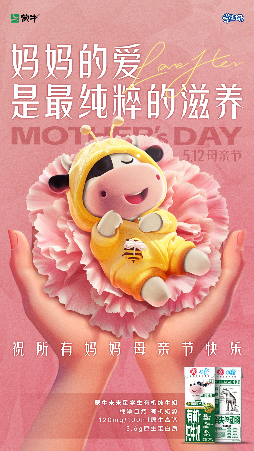 妈妈总想给孩子更好的,要吃得好,穿得暖,去看更大的世界。蒙牛学生奶也想给你更好的,自然纯净的有机环境,孕育妈妈们放心的黄金奶源!今天,请大声告诉妈妈:谢谢您的精心呵护!也请好好爱自己!