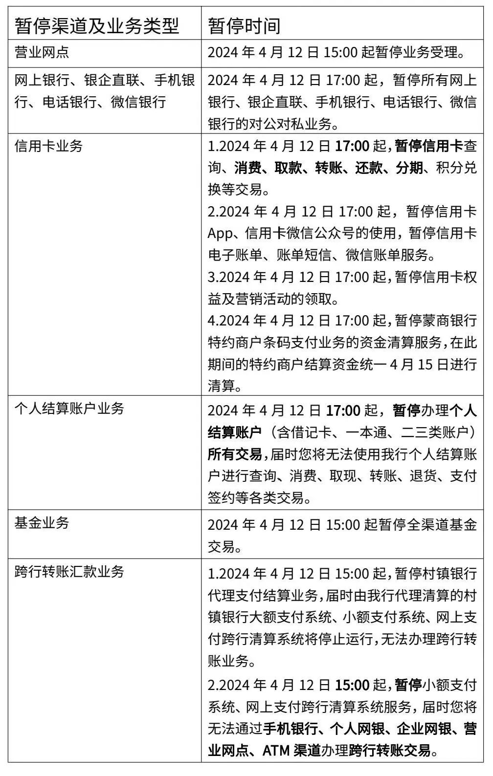 为进一步提升金融服务质量,我行将于2024年4月12日(周五)15:00至4月15日9:00(周一)进行系统全面升级。届时,营业网点、电子渠道、ATM、第三方渠道将暂停办理对公对私业务,具体时间安排详见附件。