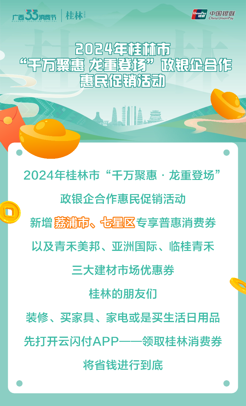 打开云闪付APP——点击桂林消费券——领取桂林各类消费券。
