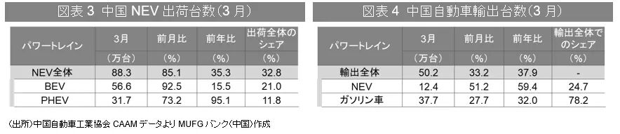2024年3月、NEV出荷台数は88.3万台(同+35.3%)、自動車出荷台数全体の32.8%を占めた。そのうち、BEVの出荷台数は前年比15.5%増の56.6万台、PHEVの出荷台数は前年比95.1%増の31.7万台となった。輸出は継続的に増加中であり、NEVは12.4万台(前年比+59.4%)、ガソリン車は37.7万台(前年比+32%)となった。
