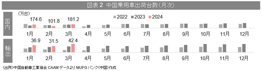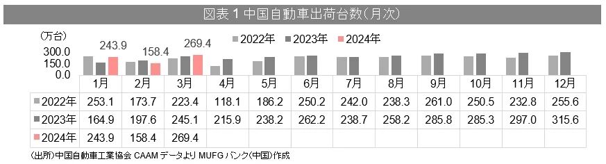 CAAMによると、2024年3月自動車(商用車含む)の出荷台数は269.4万台(前年同期比+9.9%)、うち、国内の自動車出荷台数は219.3万台(同+5.1%)、輸出台数は50.2万台(同+37.9%)。一部の地方政府は消費を喚起する為、自動車の買換を促進する政策を発表した。また、各OEMの値下げや春節明け新車の発売等により、第一四半期の国内販売が好調、出荷台数は539.6万台(同+6.2%)となった。輸出台数も132.4万台(同+33.2%)と前年を大きく上回る。