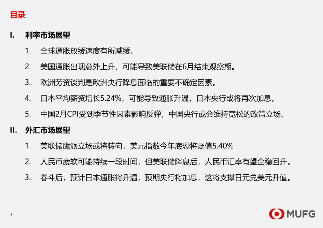 本报告由三菱日联银行(中国)有限公司(“本行”)编制,其内容仅供参考。如果任何国家或地区的任何人士或实体接收本报告或使用本报告违反其所在国家或地区的任何适用法律规定,则该等人士或实体应拒绝接收或停止使用本报告。本行和/或任何本行的关联公司和本行授权其代表本行行事的人士可在向接收人提供本报告之前,使用本报告中所含信息和基于该等信息行事。