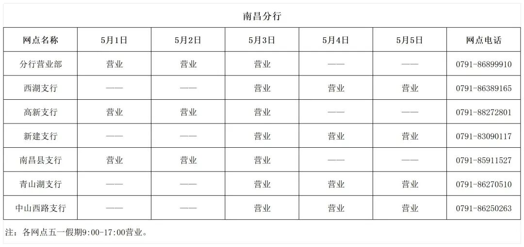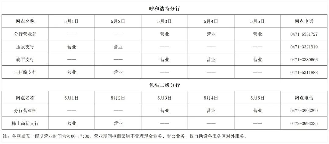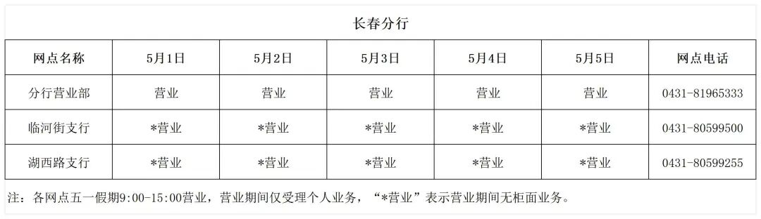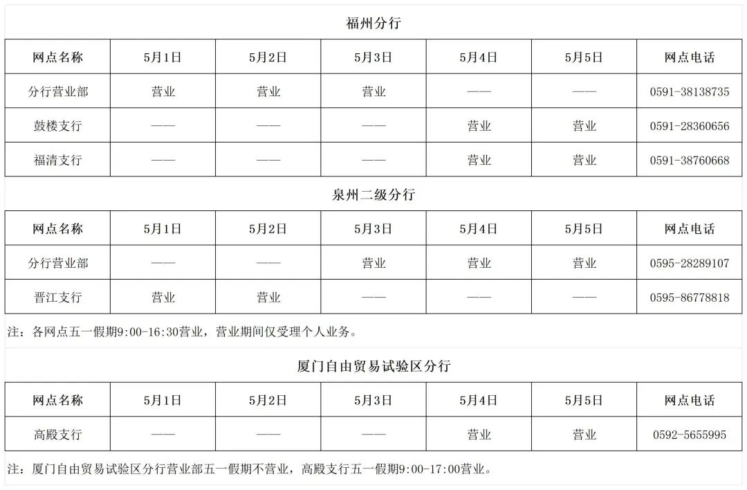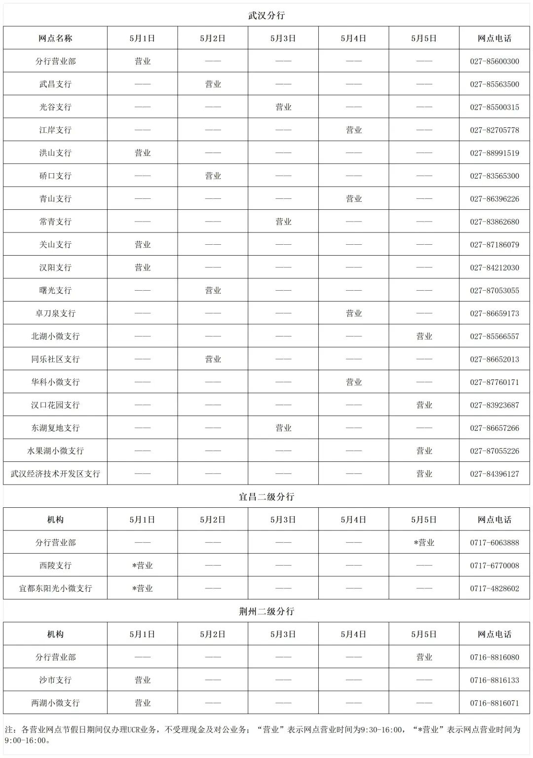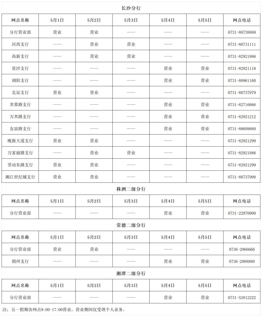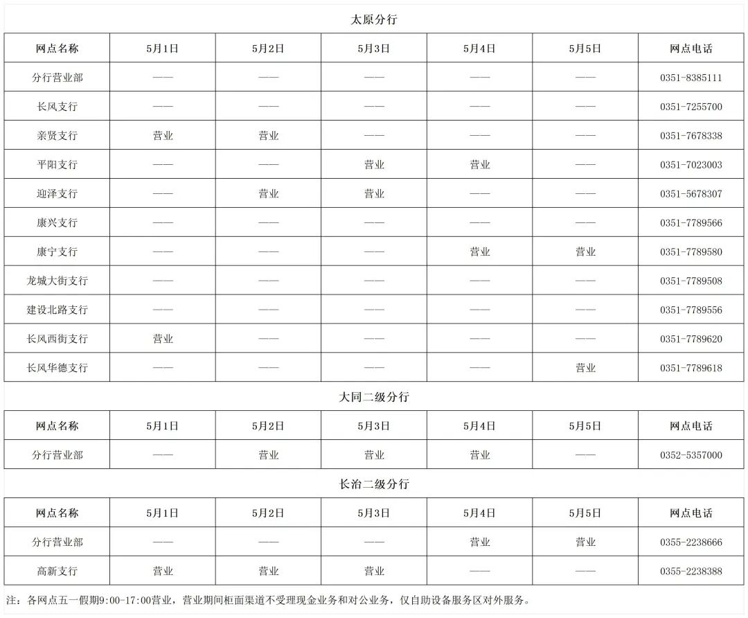 为做好五一假期金融服务工作,现将我行营业网点2024年5月1日(周三)至5月5日(周日)计划营业时间发布如下: