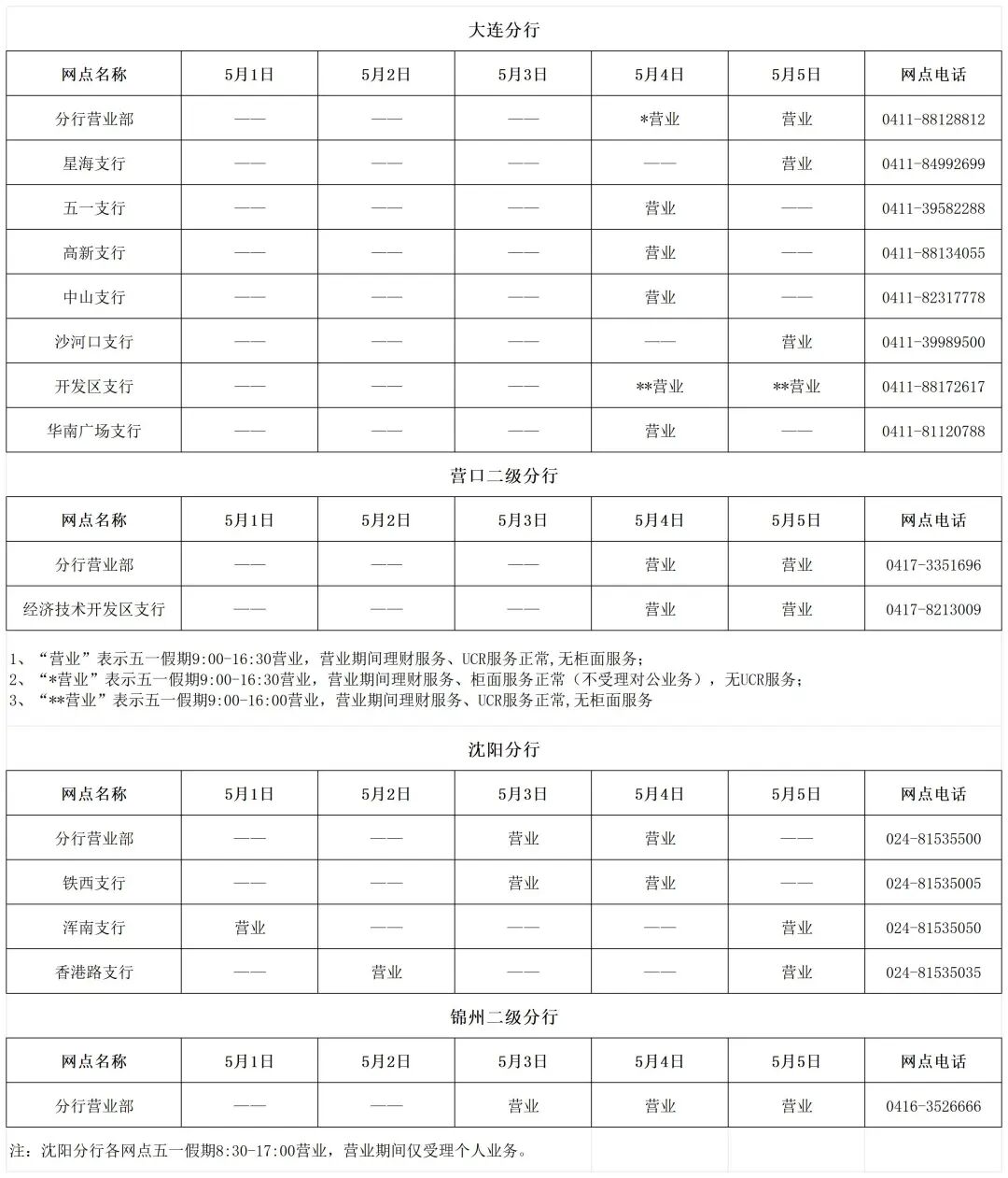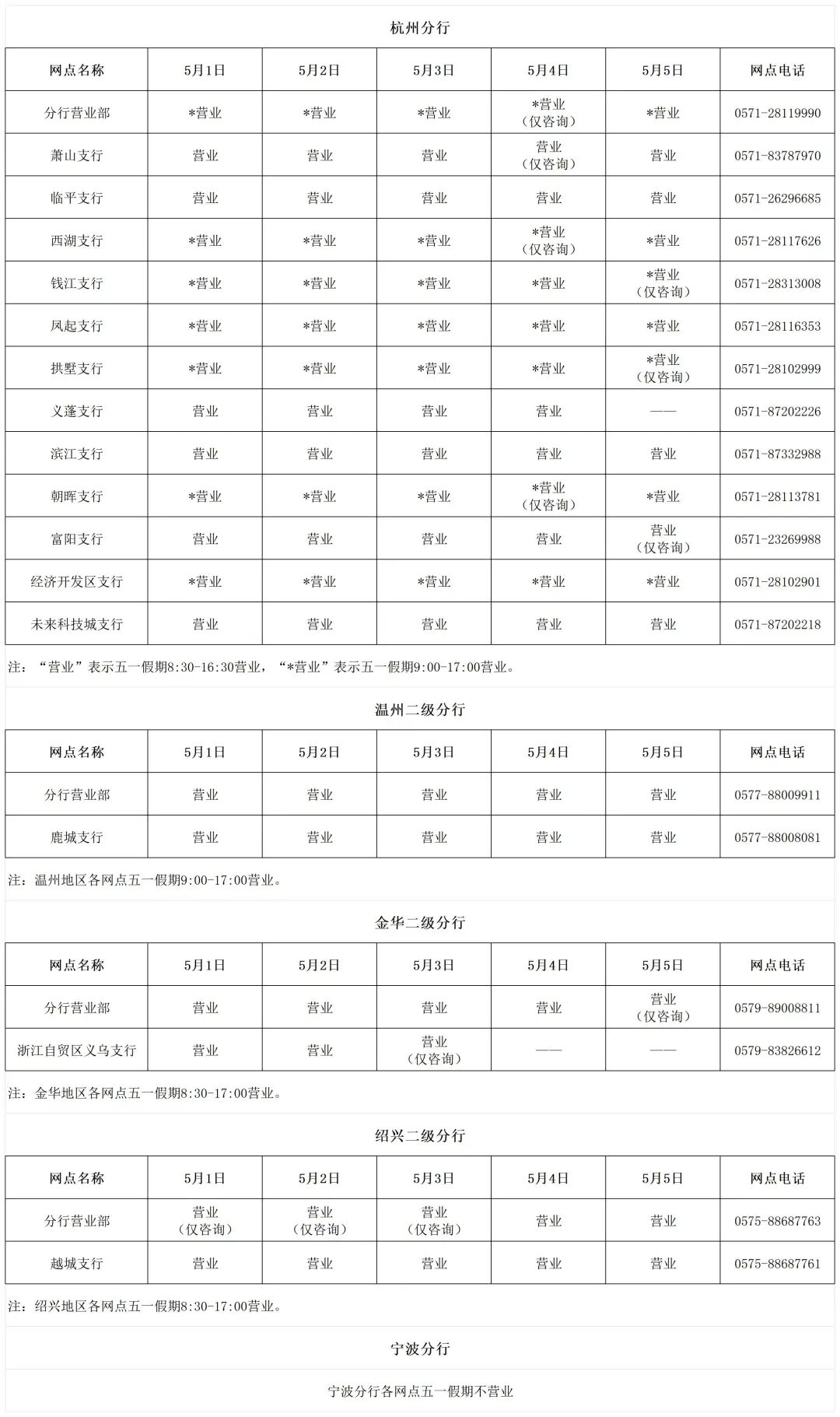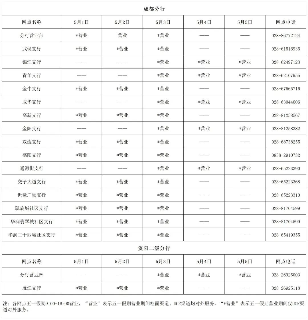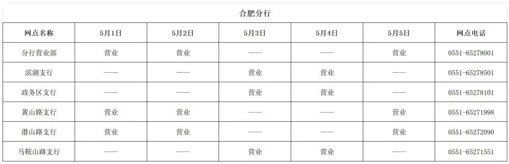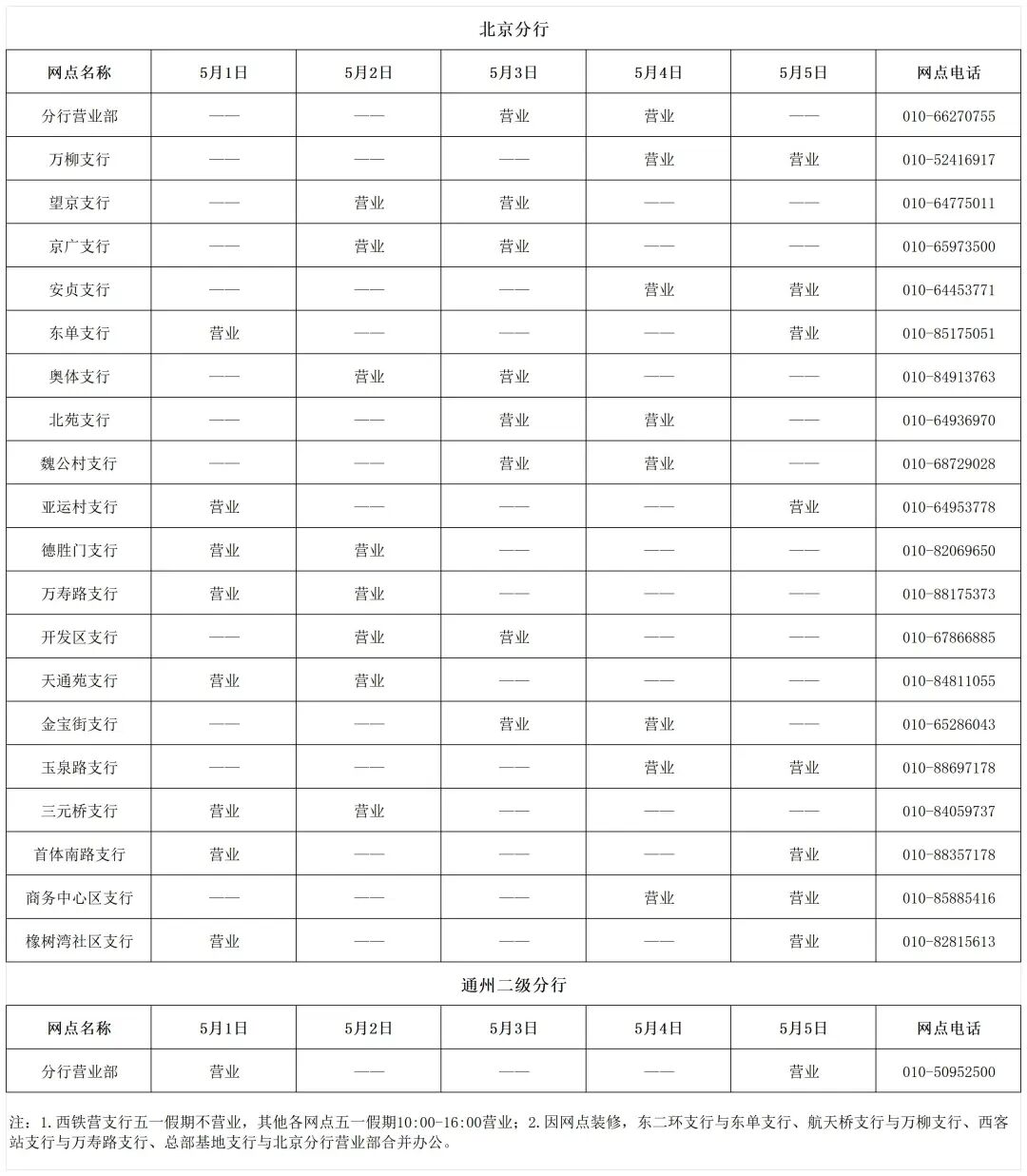 为做好五一假期金融服务工作,现将我行营业网点2024年5月1日(周三)至5月5日(周日)计划营业时间发布如下: