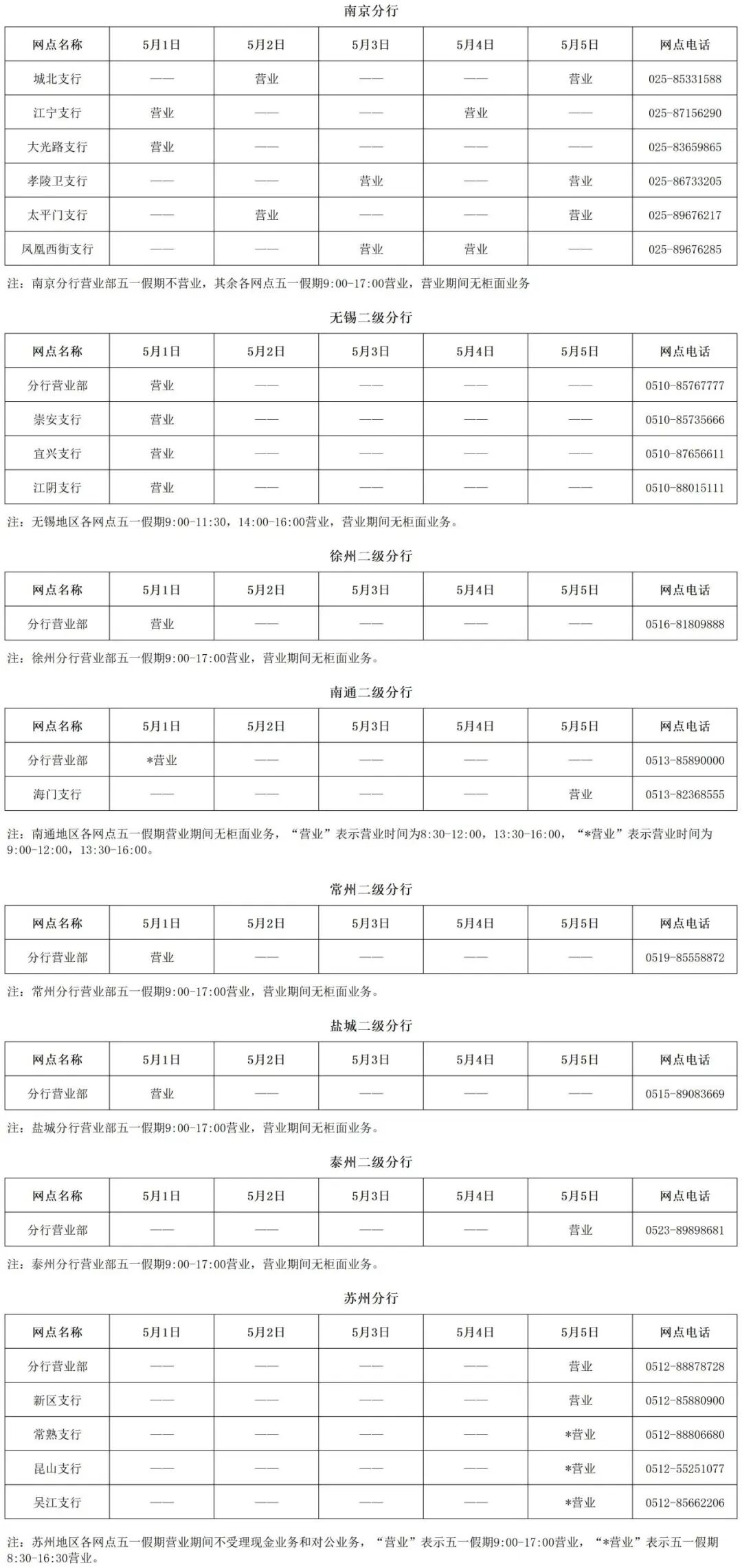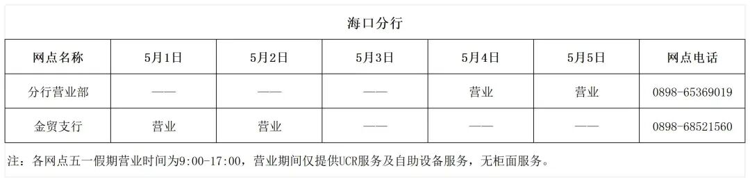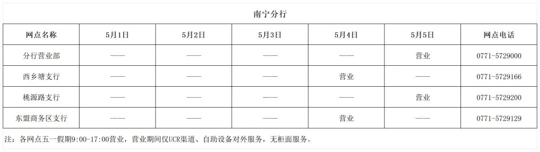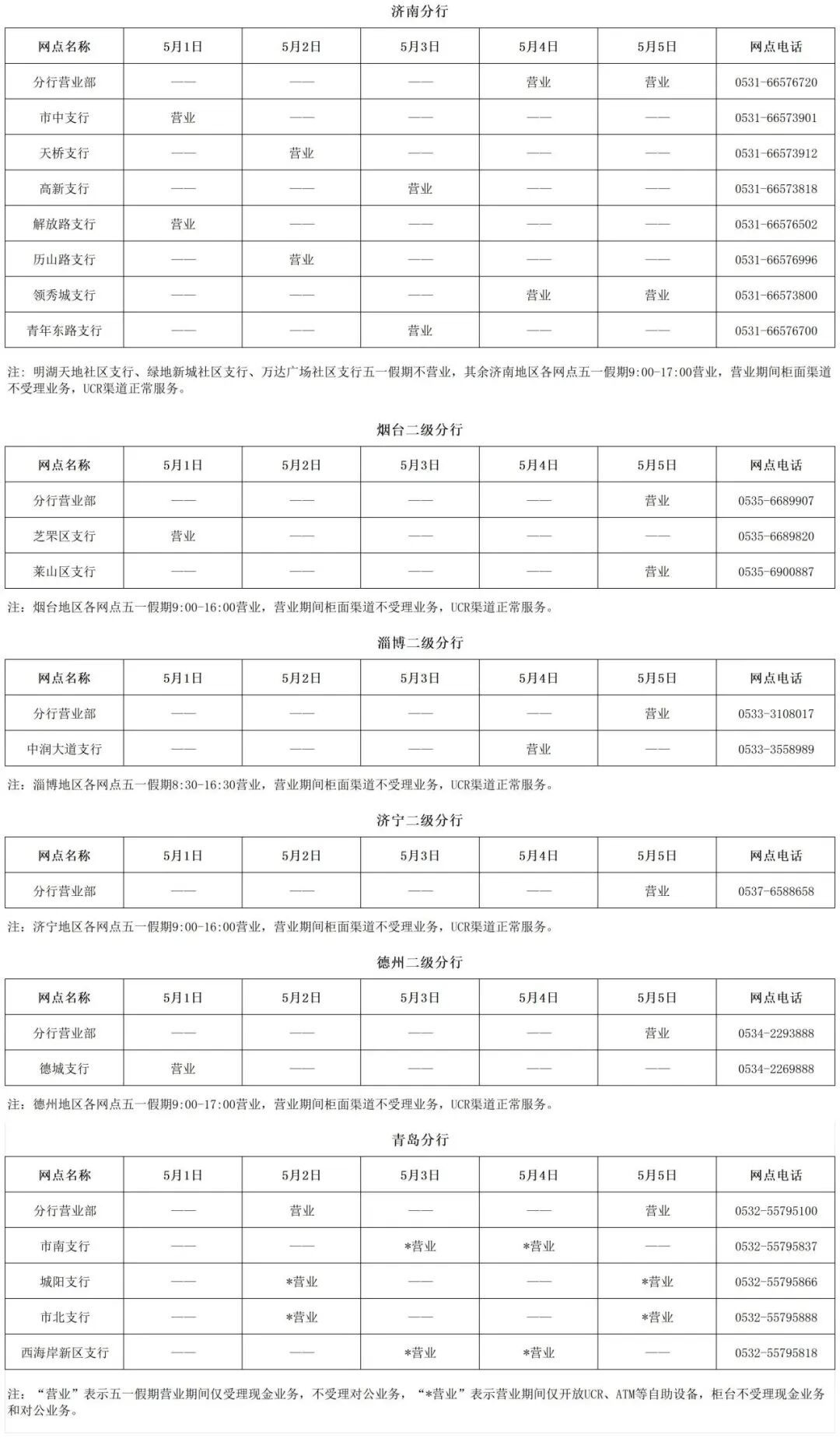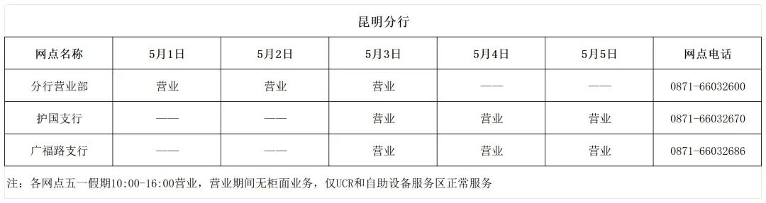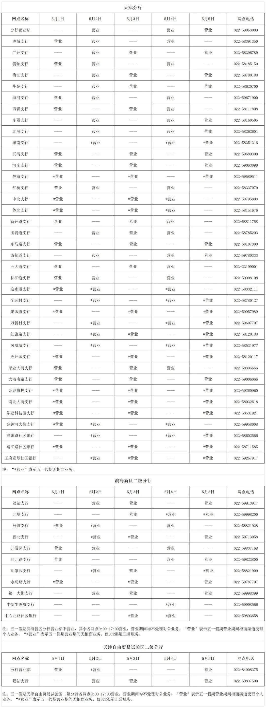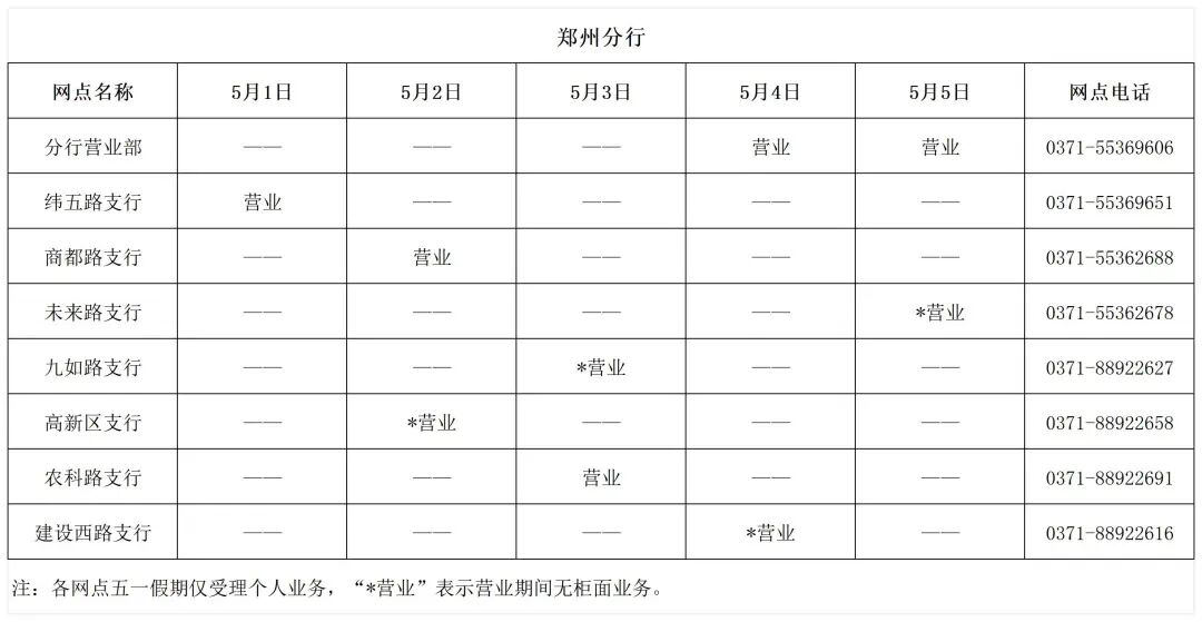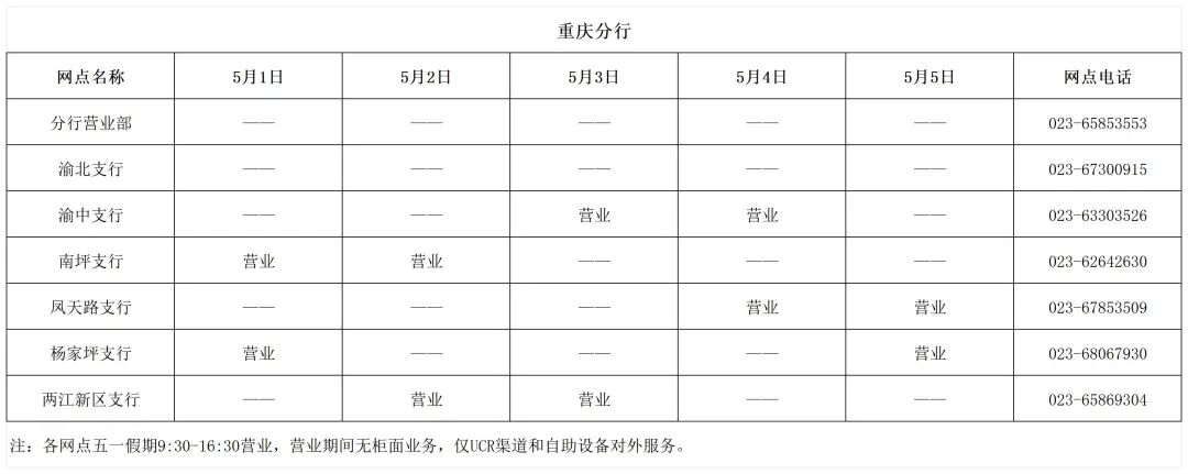 为做好五一假期金融服务工作,现将我行营业网点2024年5月1日(周三)至5月5日(周日)计划营业时间发布如下: