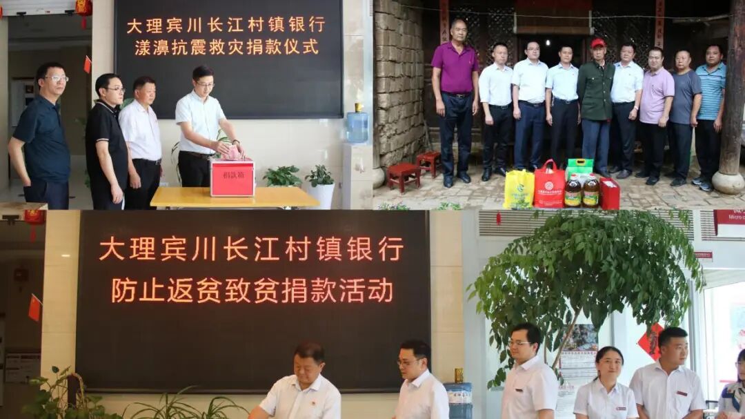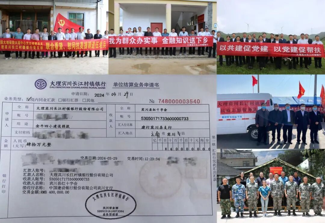 2020年3月,疫情发生后,该行及时成立抗疫志愿服务队,由行领导带领员工到全县26个社区及村居委会进行抗疫支援,提供抗疫物资,并通过宾川县红十字会捐赠款465200元,在做好疫情防控的同时,积极践行社会责任与担当。2021年5月21日,漾濞发生6.4级地震后,灾情就是命令,该行积极组织抗震救灾行动,慰问抗震救灾官兵,让有温度的银行形象在宾川大地熠熠生辉,2024年4月22日,该行响应县委县政府号召,为支持教育事业振兴,进一步改善宾川县办学条件,与宾川县红十字会签订捐赠协议,定向捐赠资金人民币四十万元,专项用于宾川县金牛镇第四完全小学公益项目建设。