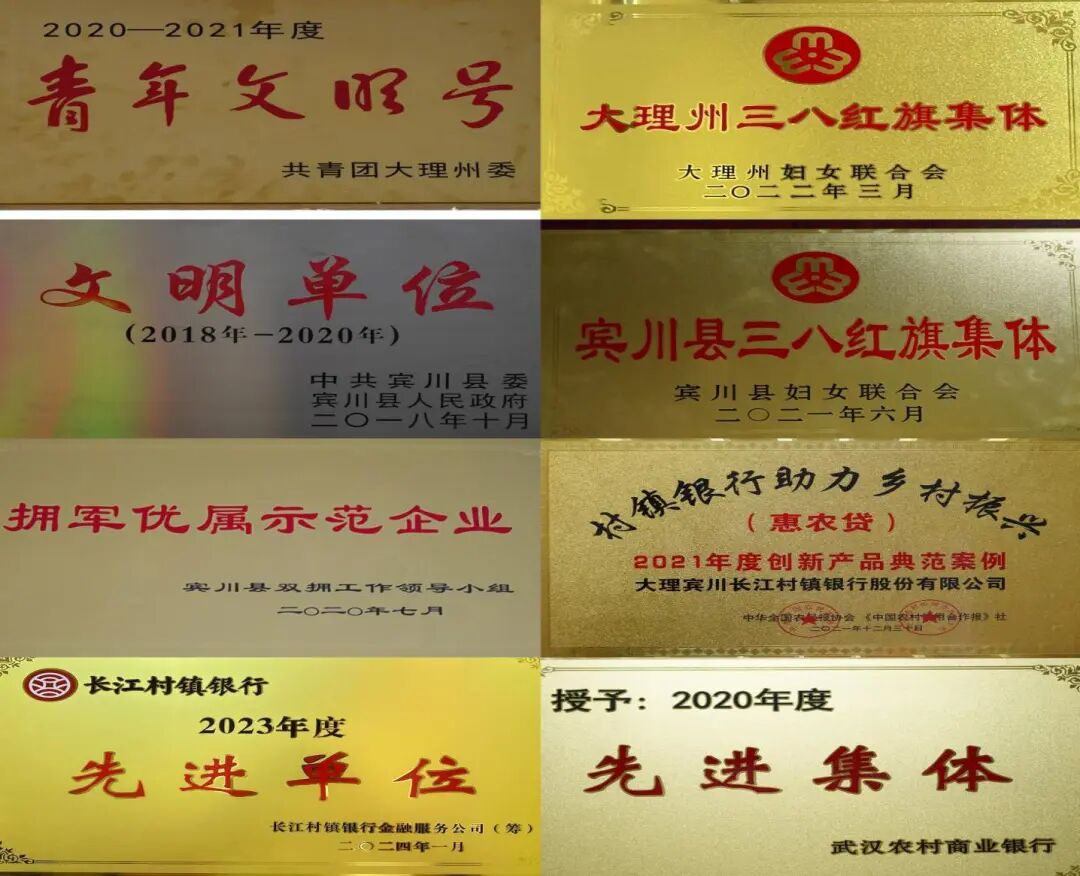 七年来,在监管部门的指导下,在地方各级党委、人民政府及广大客户的支持下,大理宾川长江村镇银行主动融入宾川发展战略,全力履行支农支小职责,着力提升服务水平、市场竞争力和经营管理水平,各项业务保持了平稳健康发展的良好势头,谱写出新时代高质量发展的新篇章。2020年9月,宾居支行成立;2023年2月乔甸支行成立。截至2024年3月末,大理宾川长江村镇银行总资产4.32亿元,经营规模达7亿元。该行先后获得“文明单位”“青年文明号”“拥军优属示范企业”“大理州三八红旗集体”等州、县级荣誉称号,荣获武汉农村商业银行2020年度“先进党支部”称号;2020年度、2021年度“先进集体”;2023年度“先进单位”,2021年12月荣获村镇银行助力乡村振兴“2021年度创新产品典范案例”。