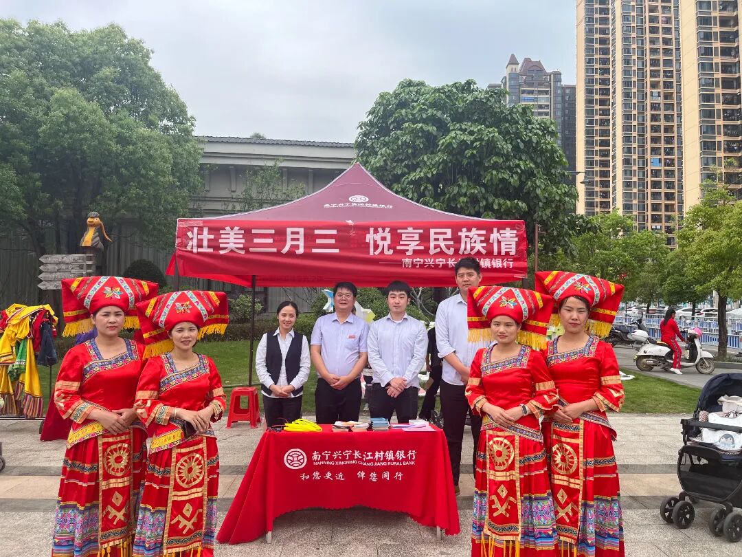 为弘扬广西壮族“三月三”传统文化,丰富居民精神文化生活,回馈广大新老客户,南宁兴宁长江村镇银行联合九曲湾社区及网点周边物业,共同举办“壮美三月三 悦享民族情”主题游园活动,积极普及金融知识惠大众。