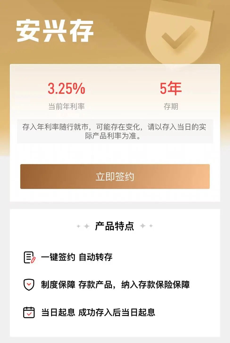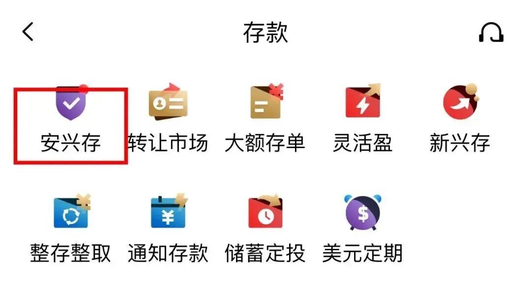 在手机银行首页找到“存款”按钮,点击跳转至“存款”页面后,再次点击“安兴存”按钮,即可跳转至“安兴存”产品页面;
