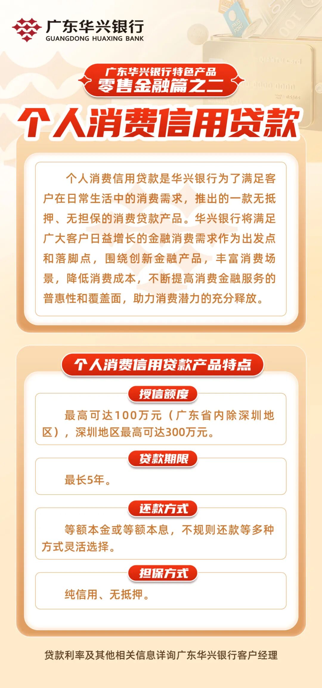 广东华兴银行将满足广大客户日益增长的金融消费需求作为出发点和落脚点,围绕创新金融产品,推出一款无抵押、无担保的消费贷款产品——个人消费信用贷款。该产品的推出,丰富了消费场景,降低了消费成本,不断提高消费金融服务的普惠性和覆盖面,助力消费潜力充分释放。