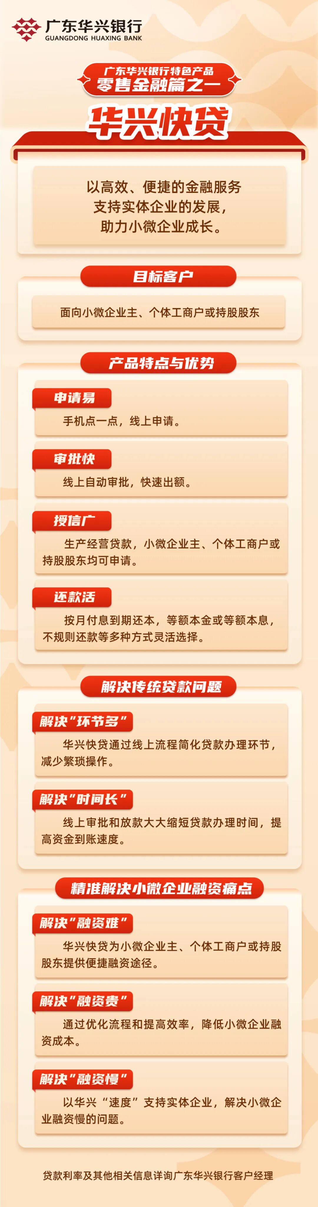 广东华兴银行利用大数据等科技手段,面向小微企业主、个体工商户或持股股东推出零售金融产品“华兴快贷”。为客户提供线上申请、线上评估、线上审批、线上放款的高效率高质量的金融产品服务。解决传统线下经营类贷款办理中环节多、时间长等诸多问题,精准解决小微企业融资“难、贵、慢”的痛点,以华兴“速度”支持实体企业。