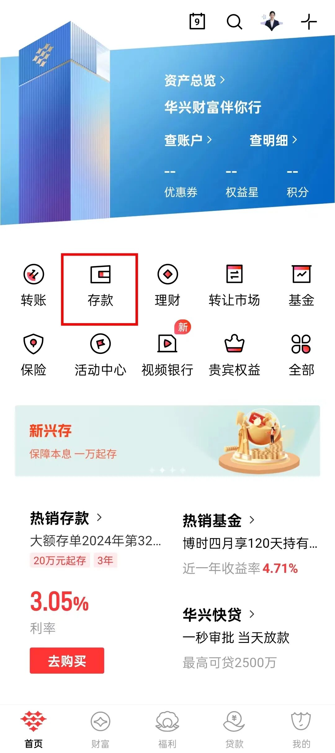 在手机银行首页找到“存款”按钮,点击跳转至“存款”页面后,再次点击“安兴存”按钮,即可跳转至“安兴存”产品页面;