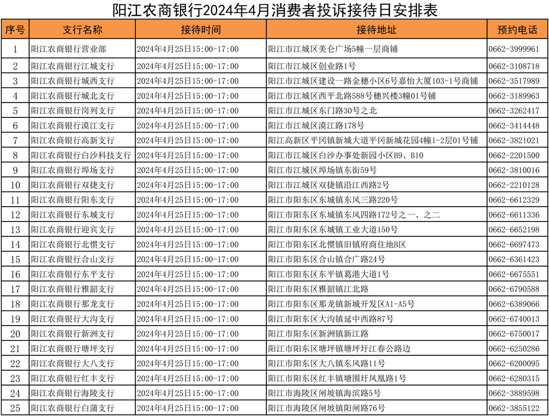 为更好地服务客户,畅通金融消费投诉渠道,保障客户合法权益,现将阳江农商银行2024年4月消费者投诉接待日安排公告如下: