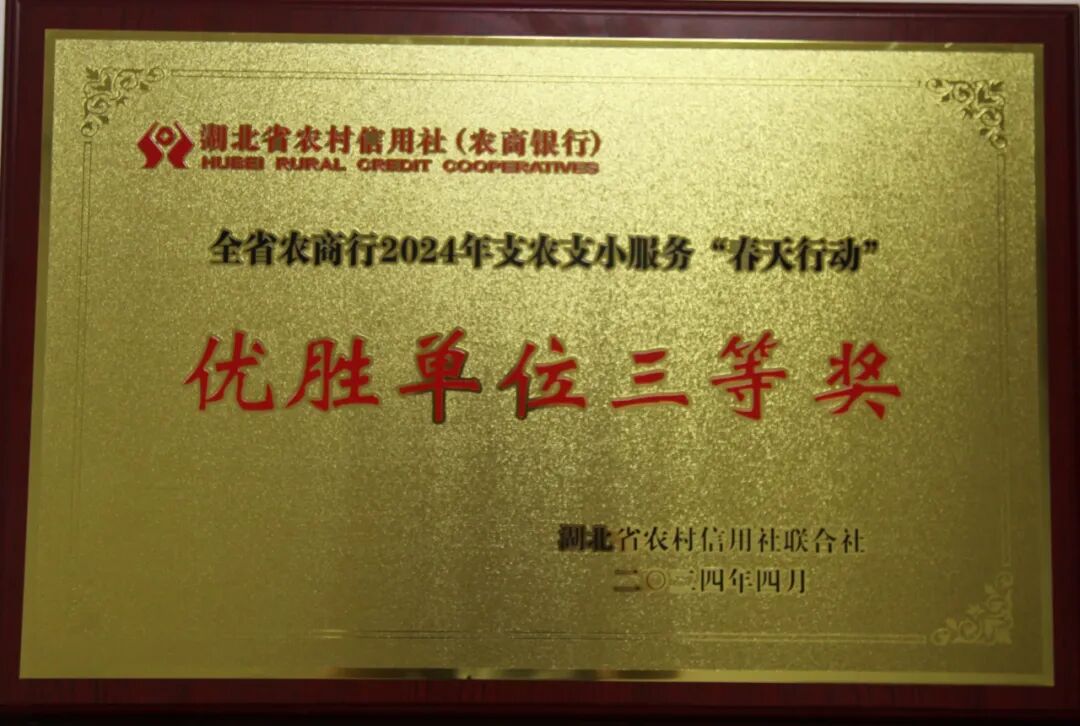 4月20日,在全省农商行2024年第一季度工作会暨“春天行动”总结表彰大会上,石首农商银行被授予全省农商行2024年支农支小服务“春天行动”优胜单位三等奖。