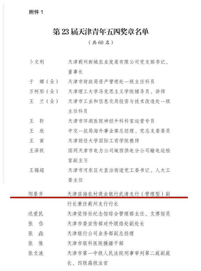 2024年是全面贯彻落实党的二十大精神关键之年。为充分发挥青年典型示范引领作用,激励全市广大团员青年踔厉奋发、挺膺担当,以永不懈怠的精神状态和一往无前的奋斗姿态投身全面建设社会主义现代化大都市、奋力谱写中国式现代化天津篇章。近日,团市委授予60名同志第23届天津青年五四奖章称号,授予10个集体第23届天津青年五四奖章集体称号。我行邹景齐同志荣获天津青年五四奖章称号。