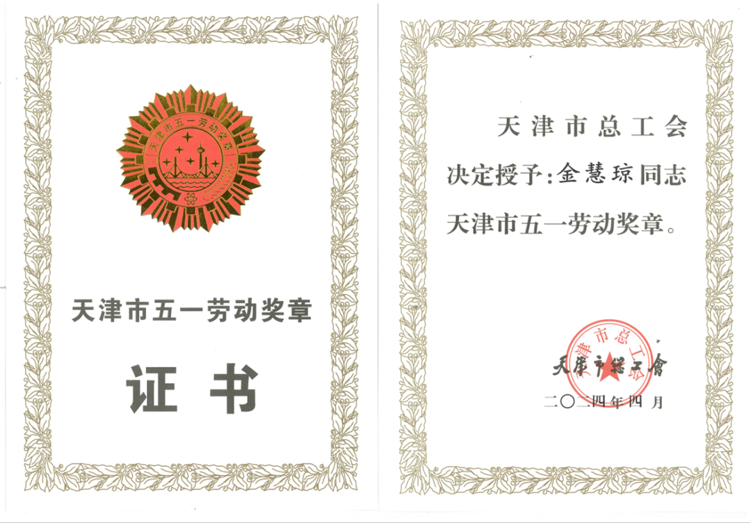 4月29日,天津市总工会召开庆祝“五一”国际劳动节大会,隆重表彰2024年天津市五一劳动奖和天津市工人先锋号获得者。我行营城支行大堂经理金慧琼同志荣获天津市五一劳动奖章称号。