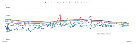 4月23日上海银行间同业拆放利率(Shibor):隔夜shibor报1.788%,上涨0.8个基点;7天shibor报1.8240%,下跌0.7个基点;14天shibor报1.9520%,下跌0.4个基点;1月shibor报1.9630%,下跌0.9个基点;3月shibor报2.0180%,下跌0.9个基点。6个月报2.0450%,下跌0.8个基点。9个月报2.0680%,下跌1.8个基点。一年期报2.0910%,下跌1.7个基点。