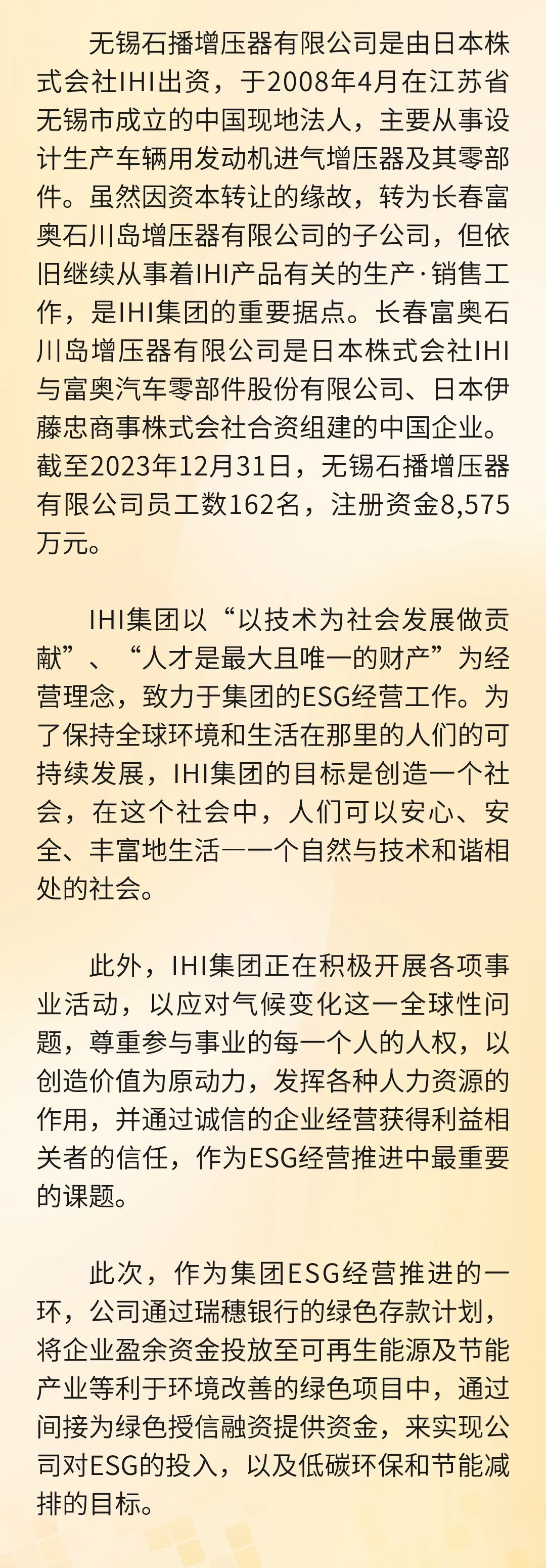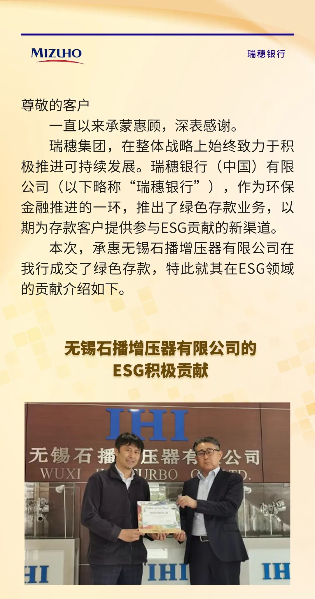• 无锡石播增压器有限公司与瑞穗银行成交【绿色存款】业务