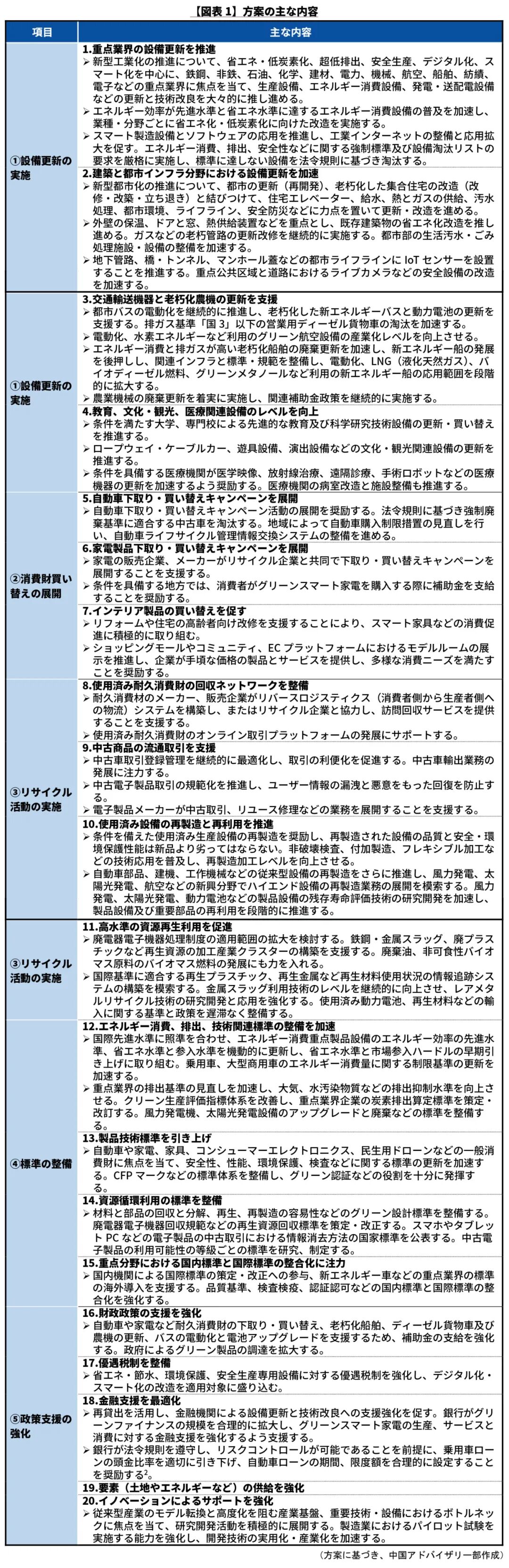 国務院は2024年3月13日、大規模な設備更新と消費財買い替えに向けた活動計画『大規模な設備更新と消費財買い替えを推進する行動方案』1(以下、方案)を公表しました。方案は、設備更新と消費財買い替えの展開、標準の整備、金融・財政支援の強化など5つの方面から20の措置を打ち出しました。鉄鋼や非鉄、石油、化学、建材、電力、機械、紡績、電子などの重点業界における設備更新、自動車と家電などの買い替え、リサイクルの促進などに関する内容を盛り込みました。