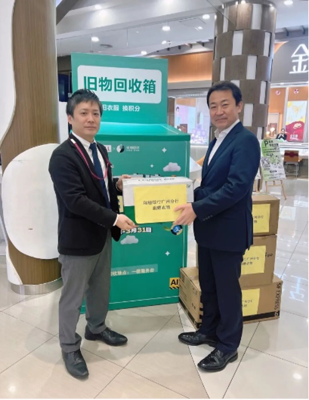 今般、当行にてイオンモール広東のサステナ事業に関して、斑鳩回収を推薦させていただきました。その後、両社の連携によって2024年1月15日から2024年3月31日まで、「古着リサイクルプロジェクト」としてイオンモール広東の4店舗で実施しております。さらに古着を寄付した顧客へはイオンモール広東で使用できるポイントを付与する事で、顧客もサステナ事業に積極的に参加できる仕組みを構築しております。このイベントに当行の広州支店行員も一丸となって参加し、総計10 kg超の古着を集めました。イベント初日に支店長の田邊よりイオンモール広東に寄贈させていただきました。