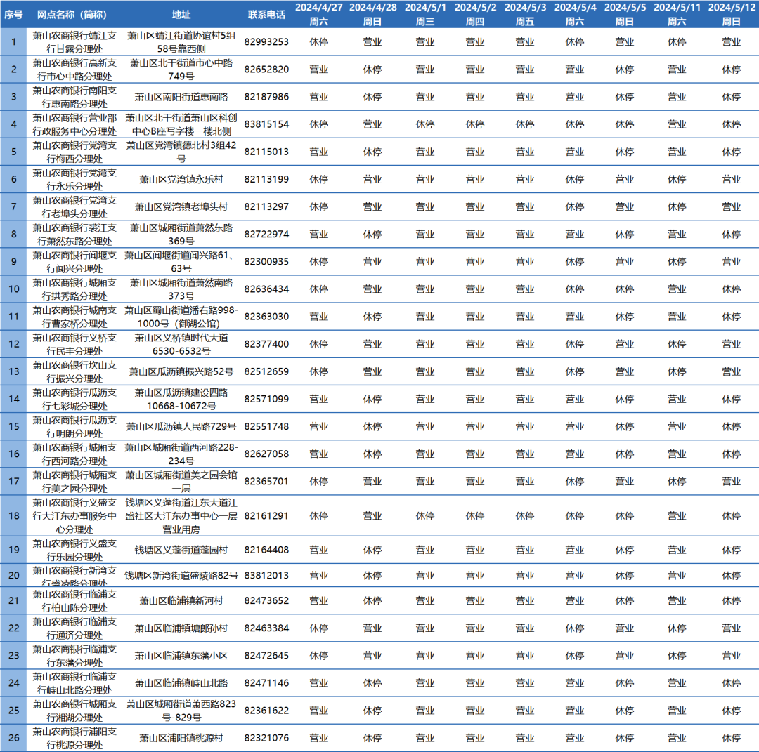 您好!为做好劳动节期间的金融服务,现将2024年4月27日至5月12日我行轮休网点营业安排公告如下(其他网点照常营业):