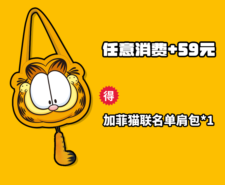 2、任意消费+59元,得加菲猫联名单肩包,具体以各渠道实际售卖情况为准,加菲猫联名周边数量有限,赠完即止。