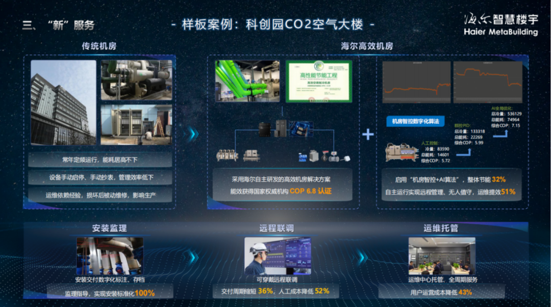 除了产品无界化发展,服务也向无界化转型。海尔智慧楼宇1+N服务新模式,以一个高效机房场景,统率N种服务模式:现场维保、无人化设备控制、远程运维......率先在海尔科创园C02空气大楼运用。
