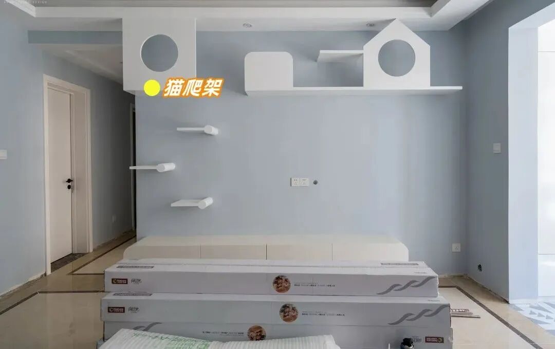 类似的阳台利用,我们施工的也不止这一家,家里有养小猫的,也可以把阳台、客厅串联起来,在这做个猫爬架。看着小猫在这爬上爬下,瞬间成了快乐的小天地,这设计不得不夸句:有创意!
