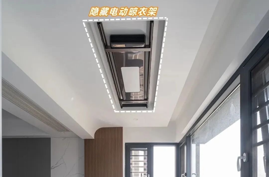 至于晾衣架,我们在吊顶时,就留好了凹槽,电动晾衣架藏在上面,不用时没有啥存在感,用的时候遥控器降下来就成,别提有多方便了,同时也避免了落灰、暴晒,好处多多。