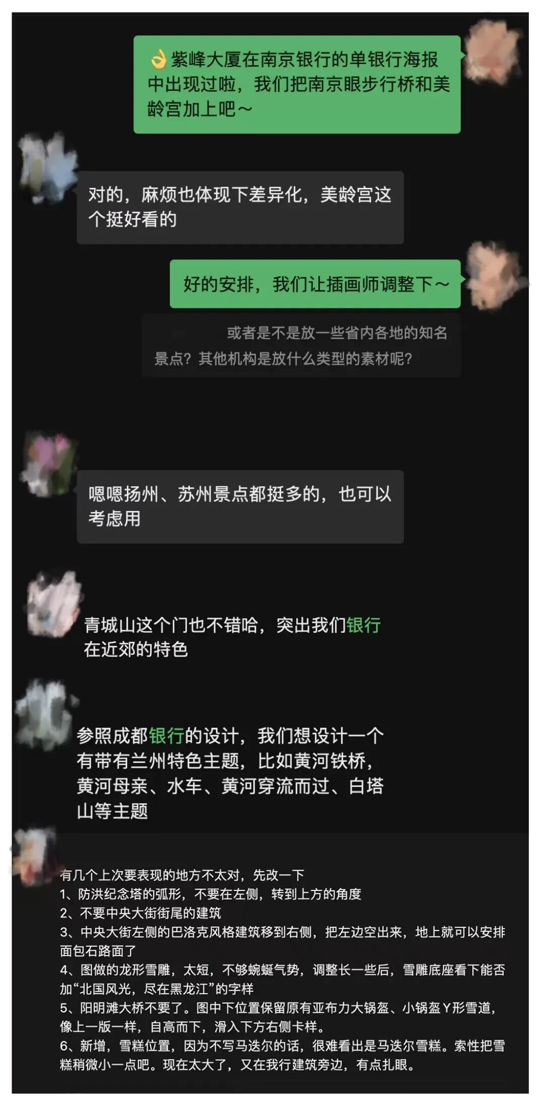 在最开始的45张海报草图阶段,要把银行卡片的3-4个重点权益要体现出来,我们就要根据它不同的推广需求去做场景设定。当时真的是每天几十个群在同时沟通。各家区域银行对这次活动都非常重视,给出的建议也都是更基于他们本土化的特质。![1713853117506711.jpg]()