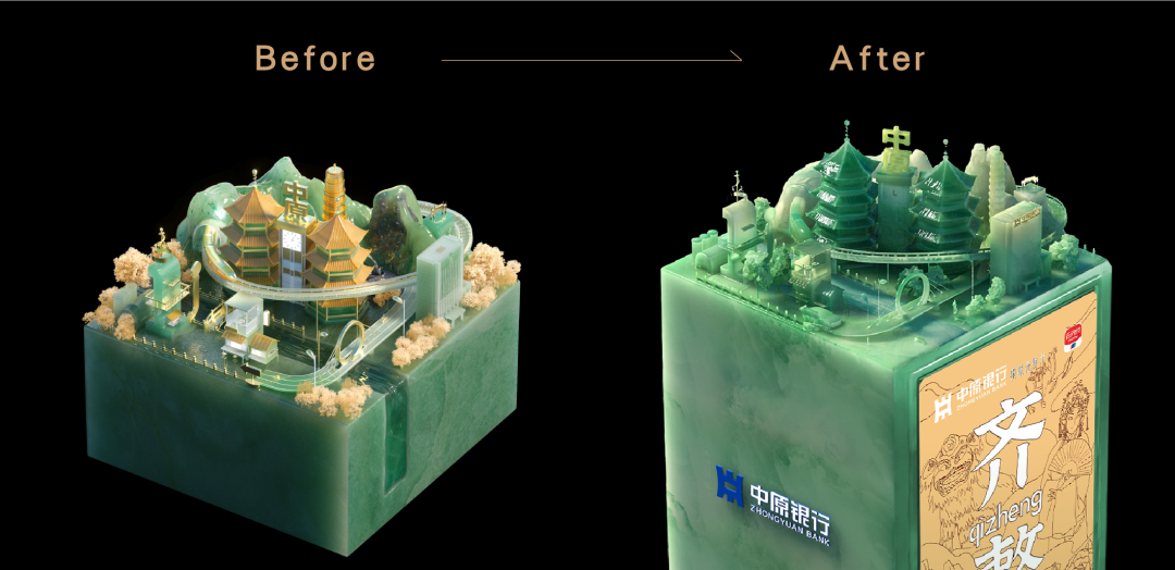 刚开始我们做的是碎玉拼接,建筑是建筑、人是人,用不同的玉去拼接。结果做出来就像积木,看起来有点廉价,失去了玉的圆润、浑然一体的感觉。后来跟水哥过了好多轮,当时水哥就说,要做减法、把材质统一成一种。再者就是把上面的形象圆润化,这样就会更接近玉的质感和光泽。修改是一个漫长的过程哈哈,我们中间和3D团队磨了很久很久……![银联,印章]()