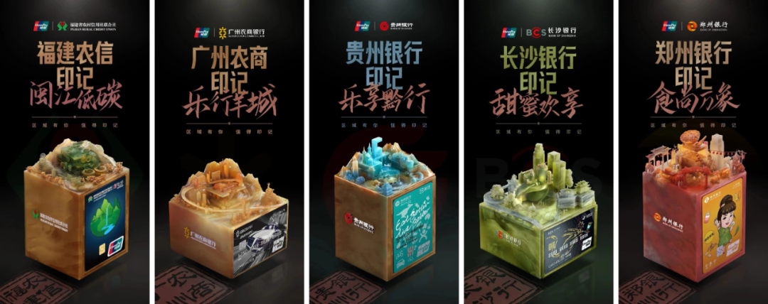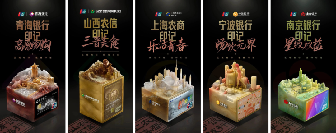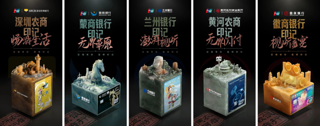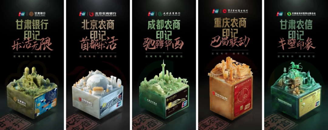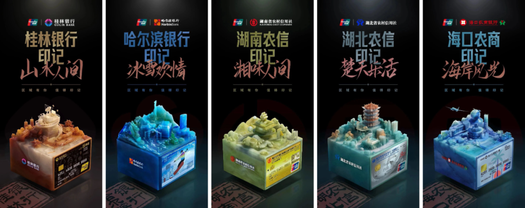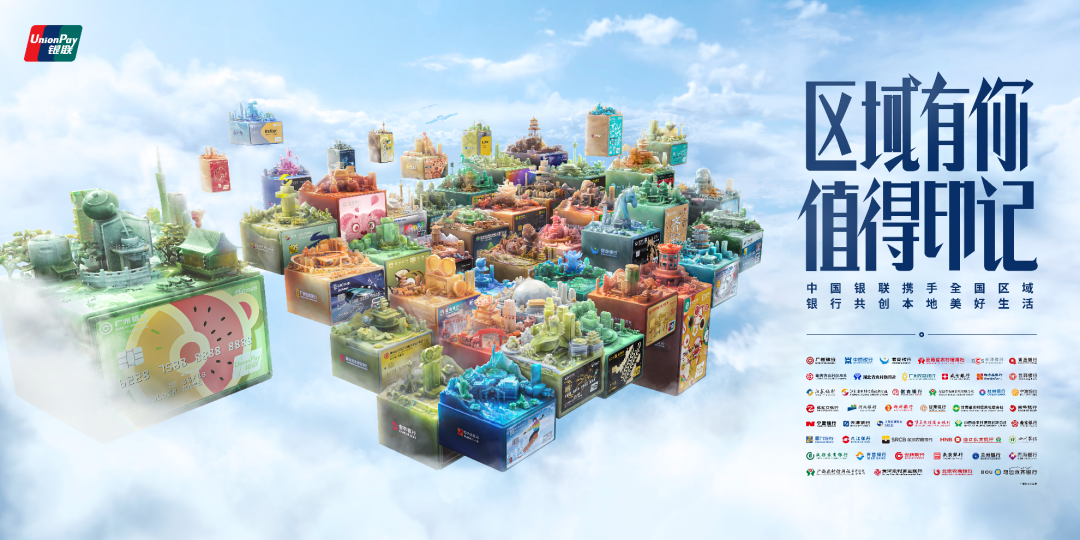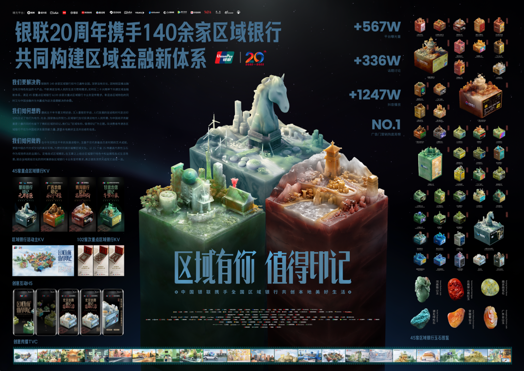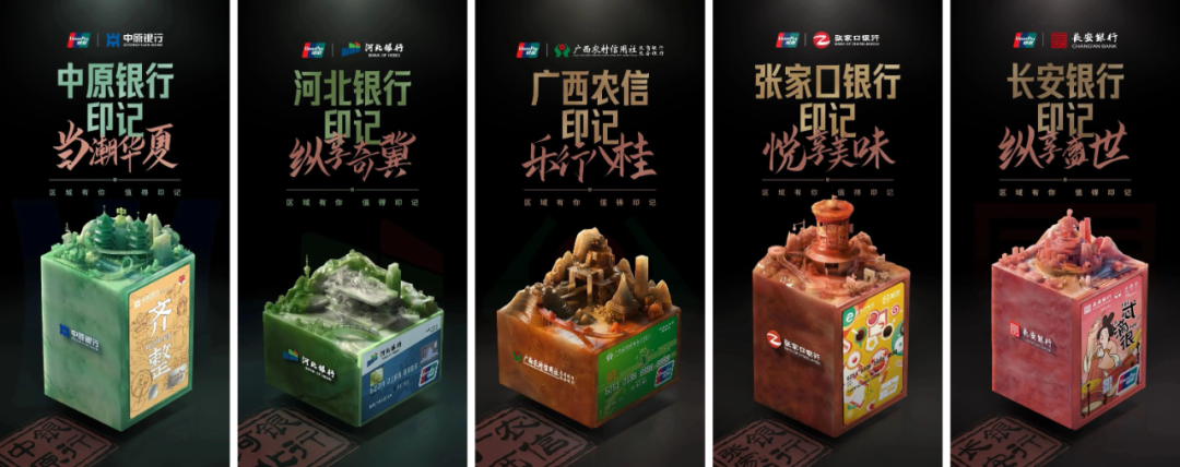 在创意的主要呈现形式上,通过一张张小小的银联卡片,我们希望传递给消费者的就是,区域银行是各个地方区域经济的共建者。在区域银行的这张卡上,它集结了各个地方的历史、特色、消费风格,也成为了给消费者带去更好生活服务的支付纽带。而且不仅仅一个地方如此,147家区域银行所覆盖的全国各区域,都如此。这是我们希望传递出来的银联和银行的品牌价值。![印章,美术]()