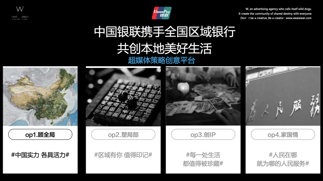 这是我们前期较大的一个难点,这些银行的属性、特点都不一样,每一家银行是基于当地城市的经济特点,形成了本行的经营业务特点,就造成了每一家银行的业务风格也不一样。我们这次核心宣传的是区域银行的银联卡产品。每一个区域银行它们本身都有自己非常鲜明的特点,所以它们在当地发行的银联卡、信用卡等产品,也都有非常浓厚的区域银行的特色。因此在这个项目中,我们通过银联卡产品平台权益这一主线,将区域银行各具特色的银联信用卡整合成一个紧密相连的网络,形成了一个统一而多元的支付生态,既展示了区域银行品牌的多样性,又保持了银联卡品牌的一致性。![银联,W]()