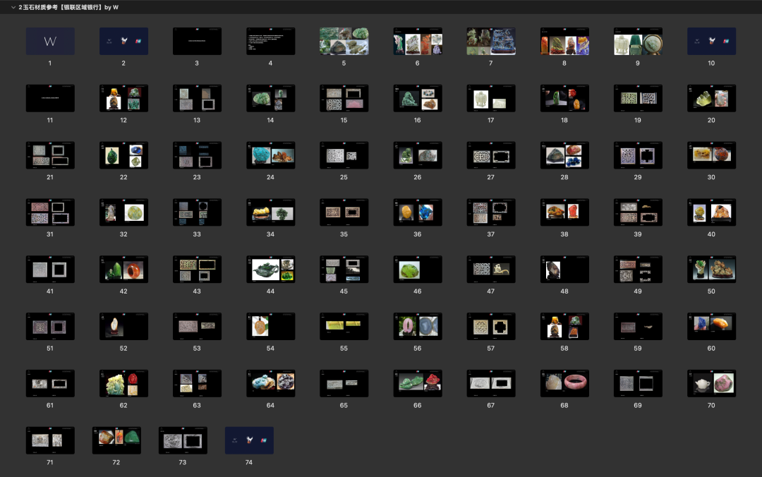 因为这个项目后期玉石渲染的工程量是非常大的,所以我们把所有的设计在草图阶段就跟客户确认下来,反复跟他们强调进入渲染就不能改了哦,然后挨个把这45张草图敲定,再由我们去跟3D团队沟通玉石渲染的细节。![银联,W]()