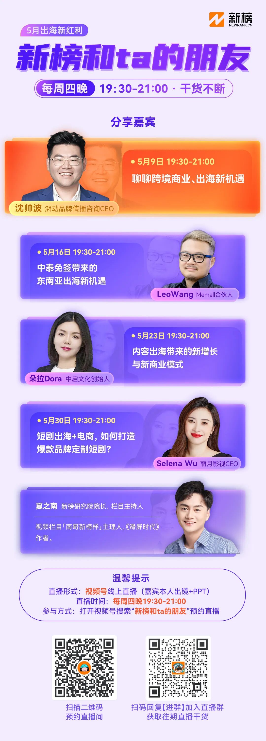 一键预约,锁定精彩直播!“新榜和ta的朋友”将与您一起,扬帆起航,共探出海新蓝海。