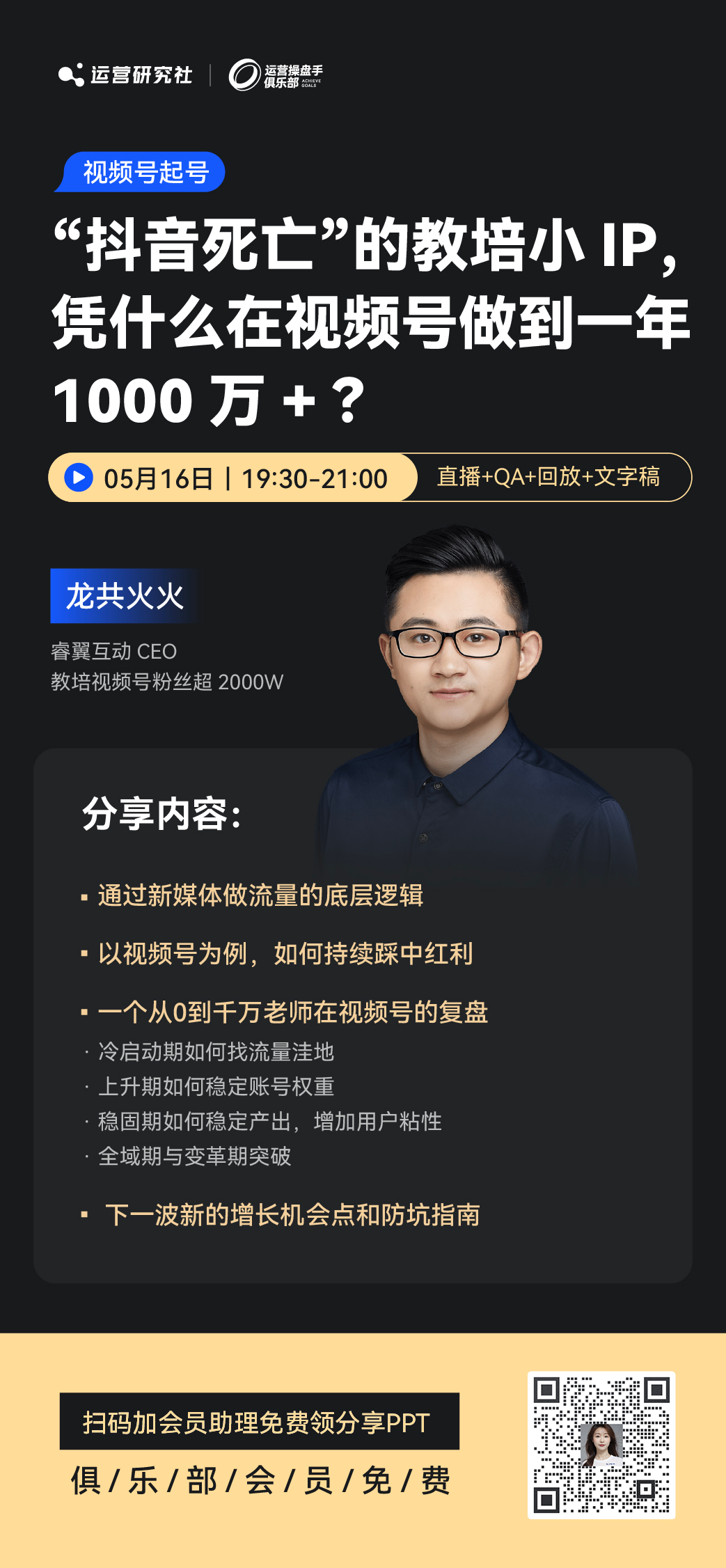 【运营操盘手俱乐部】为聚集各个行业「运营操盘手」的圈子,提供全年40场+实战案例分享、专属交流群、精品资料库、线下活动等服务,助力操盘手拿到更大的流量获取、私域运营、交易转化结果。目前已经有 600+来自电商、线索、本地型业务的优秀操盘手加入。「运营操盘手俱乐部」 嘉宾分享第24期来了!我们邀请到了教培视频号粉丝超2000W、教育MCN睿翼互动 CEO 龙共火火老师来分享。火火老师是教培行业资深从业&创业者。从 2019 年刚创业做微信裂变,在平台打击裂变后看准短视频机会入局快手和抖音,21年又果断入局视频号;目前团队旗下已有短视频家长类粉丝超 6000w。去年,龙共火火和团队帮助一位在抖音销量骤跌,一天只能卖两三千的老师,在视频号很快做到月售百万+。凭什么能在视频号快速起号?为什么说相比抖音,教培小IP适合做视频号?火火老师提到:第一,抖音是商业化的竞争市场,大老师主要靠投流,小老师抢不过;第二,视频号有反爬机制,小老师可以“闷声”赚钱,再加上自己的私域驱动,拿到结果更容易。如果你也是教培行业,如果你想抓住视频号的这波机会,如果你想要通过IP内容的方式起号赚钱,本期分享建议你听!直播时间:5 月 16 日(周四) 19:30-21:00,包含 1 小时左右的分享,以及 20 分钟左右的 QA 互动。非会员对本次分享感兴趣的,欢迎扫描下方二维码添加会员助理咨询加入,在嘉宾分享结束后,可以领取本次分享的ppt 脱敏版!
